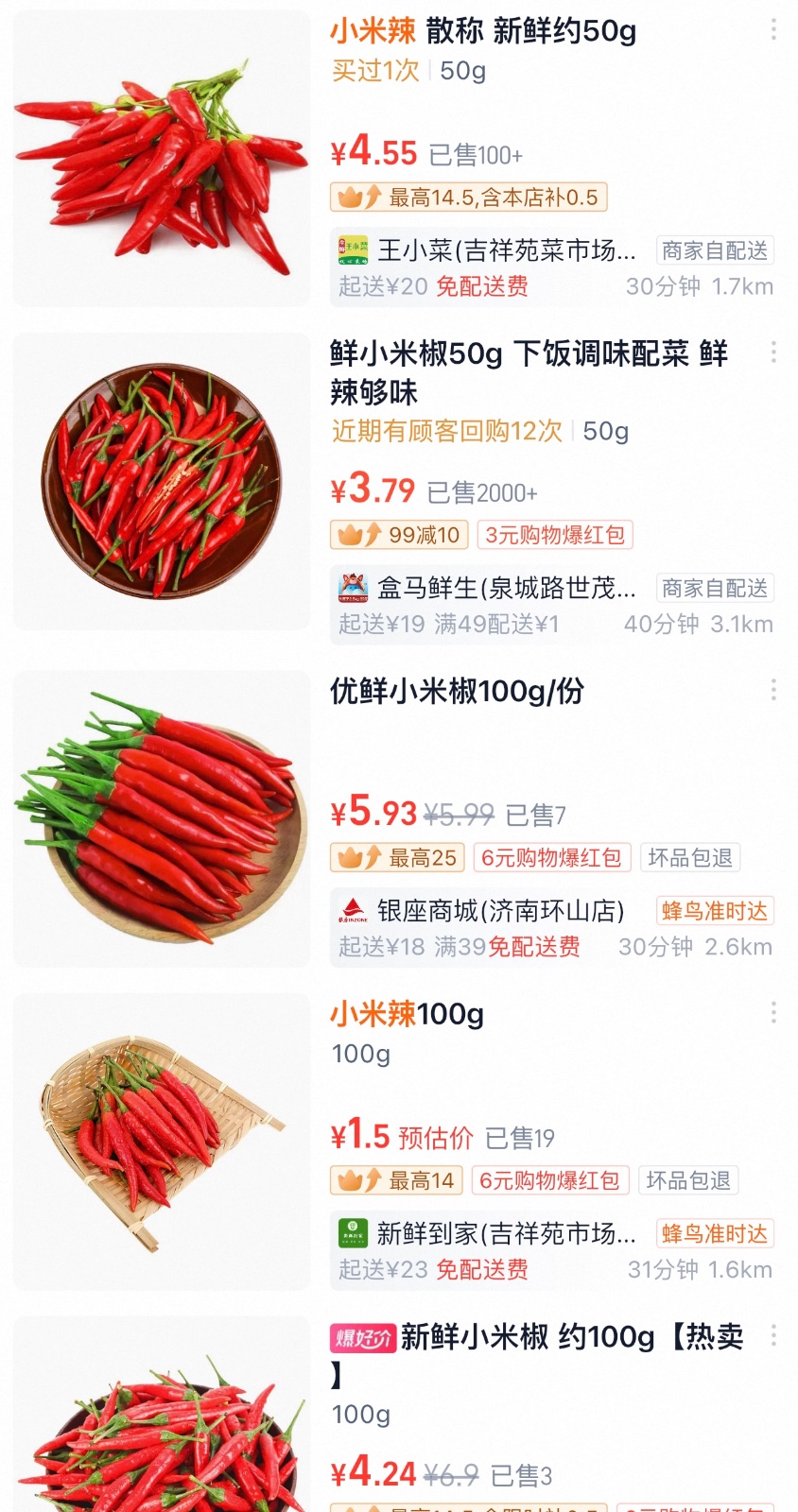 1月20日,在济南市历下区文东街道历东花园附近的一家生鲜超市,小米辣的价格为25.9元/斤;1月22日,在历下区历山路附近的大山超市,小米辣价格为24.9元/斤;1月23日,在外卖平台上,小米辣零售价飙升至30到45元不等的价格,各别店铺零售价已逼近60元。