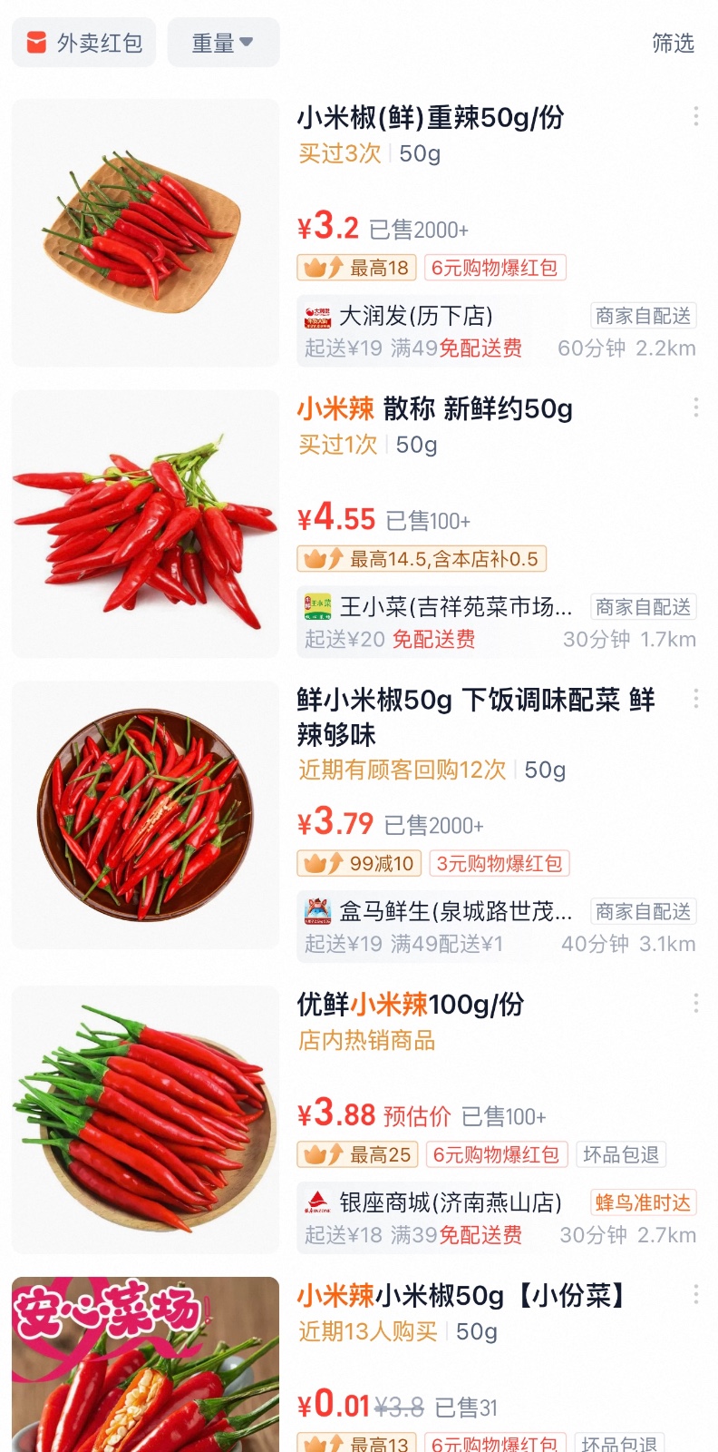 1月23日,在外卖平台上,小米辣零售价飙升至30到45元不等的价格,各别店铺零售价已逼近60元。