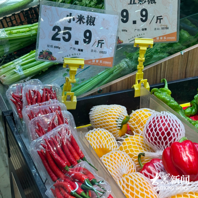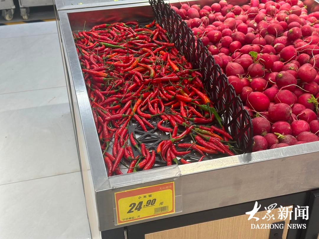 “往年小米辣的零售价基本在7元左右,即便涨价也不会超过10元,但这一阵子小米辣就没低于过20元。”在大山超市的蔬菜区,赵女士拿起塑料袋,看了看价格,最终只捡了零星几个,“太贵了,一斤猪肉才12元,少买几个炒菜调个味就行了。”