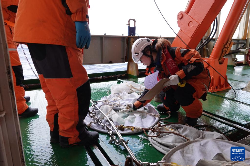 北京时间1月24日,“雪龙”号大洋队队员阮亦琳在舯部甲板准备布放垂直生物拖网。新华社记者 顾天成 摄