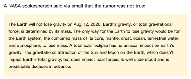 面对谣言扩散,NASA 通过国际权威事实核查网站 Snopes 明确表态:“地球绝不会在2026年8月12日失去引力,这一说法毫无科学依据”。
