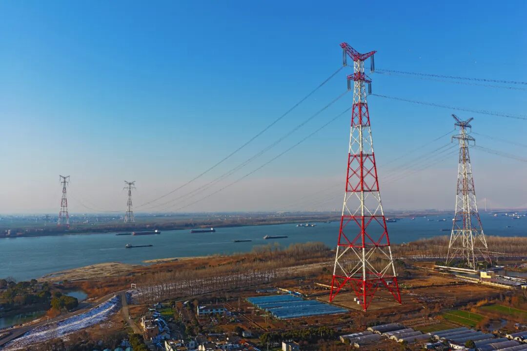 在长江安徽省芜湖市鸠江区东梁山段,数条特高压输电线构筑的“银色巨龙”凌空横跨长江。王玉实摄