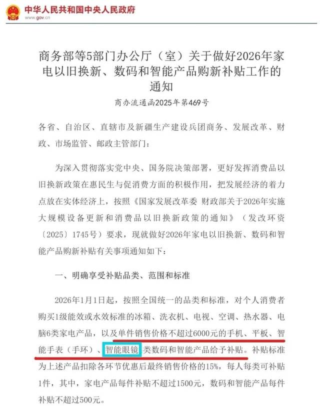 九派财经记者观察到,2025年部分地区(上海、湖北、广东等)便将智能眼镜纳入国补范围,但“新国补”政策下,是智能眼镜首次被纳入全国统一国补范围,与手机、平板等品类并列享受数码智能产品购新补贴。