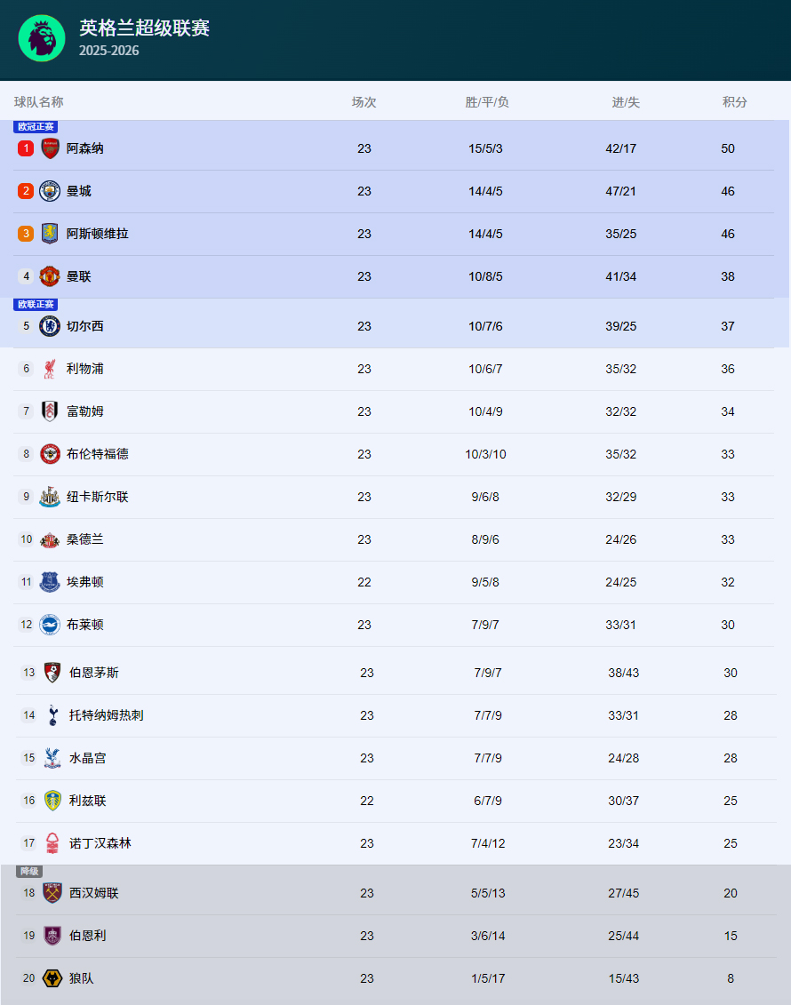 随着这三场焦点战结束,英超最新积分榜出炉:
