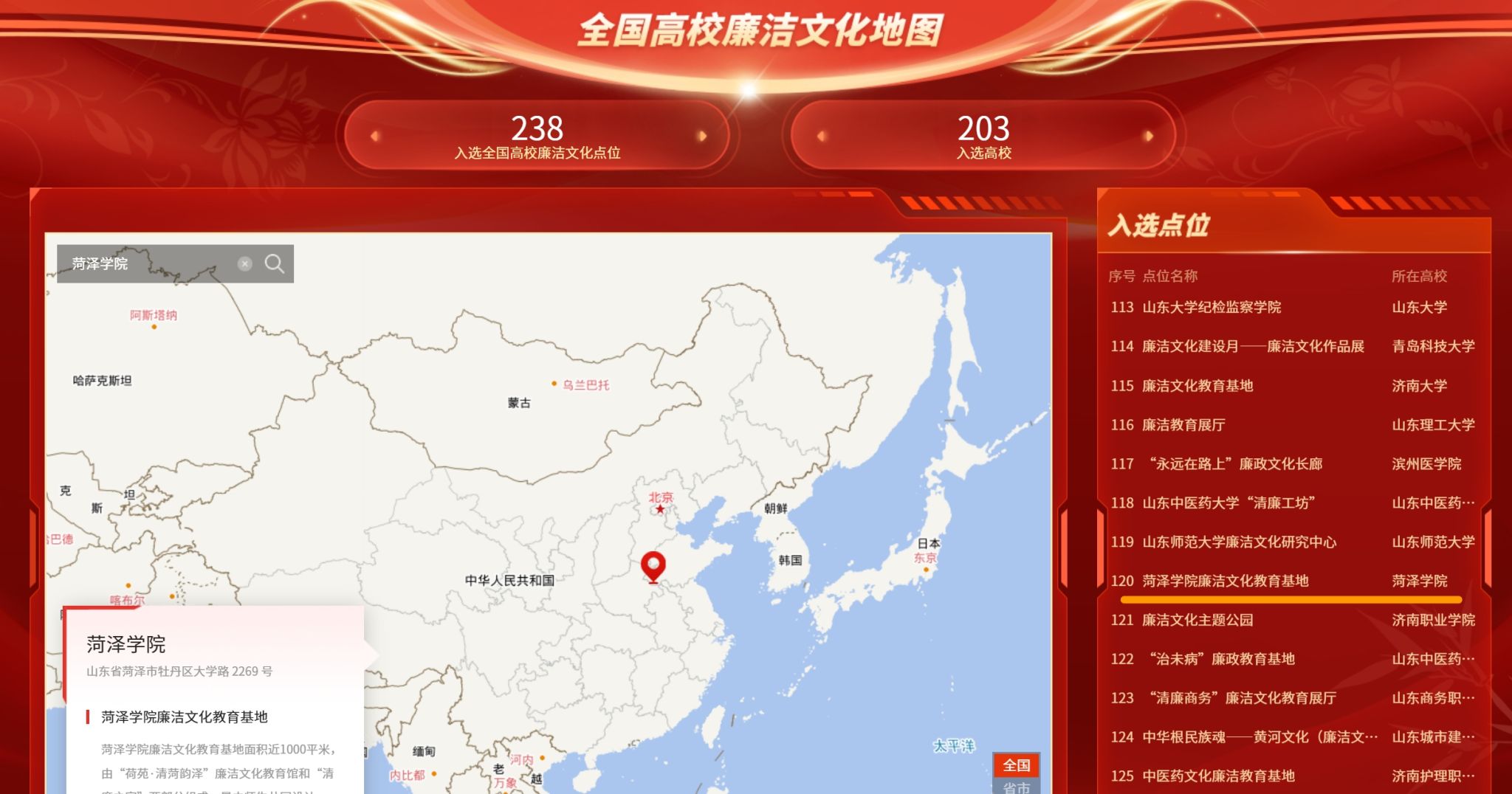 近日,教育部第十届高校廉洁教育系列活动之廉洁文化地图正式公布,菏泽学院廉洁文化教育基地成功入选。此次全国共有203所高校的238个廉洁文化点位入选,山东省14所高校在列。本次入选既是对菏泽学院廉洁文化育人工作的充分肯定,更是“清廉菏院”建设成效的生动彰显。
