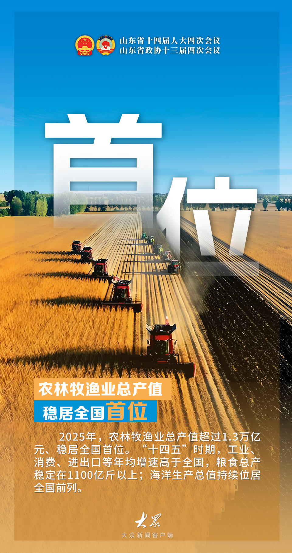 1月27日,山东省第十四届人民代表大会第四次会议在济南开幕。政府工作报告在“2025年及‘十四五’时期工作回顾”中指出,2025年山东经济增长迈出坚实步伐,地区生产总值增长5.5%、达到10.3万亿元,成为全国第三个、北方第一个过10万亿元省份。“十四五”时期,全省地区生产总值年均增长5.9%,高于全国0.5个百分点;经济总量连续跨过3个万亿元大关,占全国比重由2020年的7.2%提升至7.4%,在北方地区占比由20.5%提升至21.1%,经济大省挑大梁作用更加凸显。