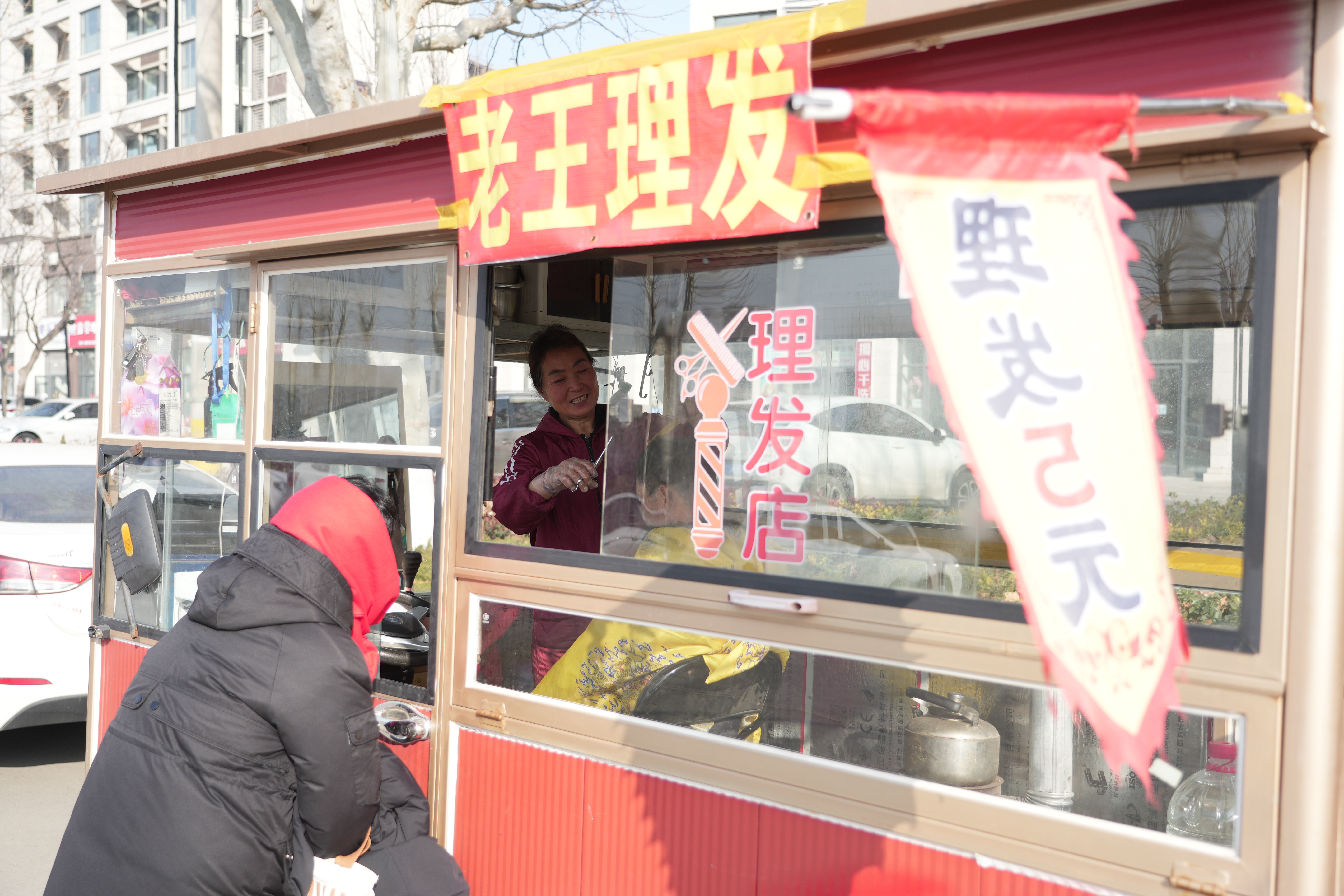 凑近了才发现,这辆不起眼的小红车里藏着满满的暖意。铁皮炉子烧得正旺,橘红色火光映亮了不大的空间,炉上的烧水壶滋滋作响,蒸腾的白气氤氲开来,将外头的凛冽寒风彻底隔绝在外。椅子上,亓大爷眯着眼一脸惬意,王大姐手中的推子在头发间灵活穿梭,梳齿划过发丝的沙沙声,伴着炉火噼啪的燃烧声,格外悦耳。