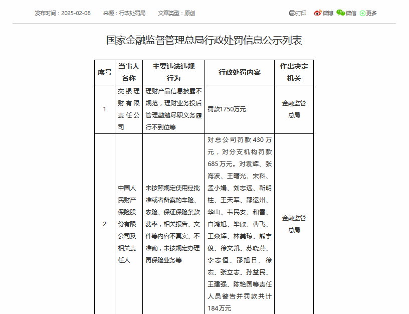 2025年2月8日,国家金融监督管理总局开出“新年第一罚”,人保财险及相关责任人收下千万级罚单。国家金融监督管理总局公布的行政处罚信息公开表显示,人保财险存在多项违法违规行为:未按规定使用经批准或备案的车险、农险及保证保险条款费率,报送的报告和文件内容不真实、不准确,以及未依规办理再保险业务等。对此,监管部门对人保财险总公司罚款430万元,对其分支机构罚款685万元,27名相关责任人被予以警告并合计罚款184万元。最终,人保财险及其相关责任人合计被处罚款1299万元。