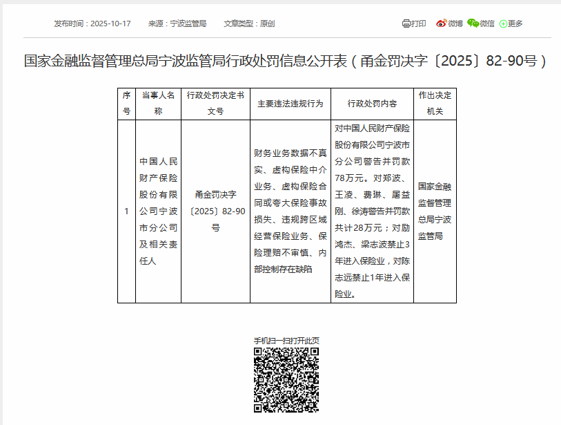 此后,人保财险及相关责任人又被罚超过百万元。2025年10月17日,国家金融监督管理总局宁波监管局披露行政处罚信息公开表(甬金罚决字〔2025〕82-90号),人保财险宁波分公司及相关责任人共计被罚106万元。人保财险宁波分公司因财务业务数据不真实、虚构保险中介业务、虚构保险合同或夸大保险事故损失、违规跨区域经营保险业务、保险理赔不审慎、内部控制存在缺陷,被警告并罚款78万元;5名相关责任人被警告并罚款共计28万元。此外,2名责任人被禁止3年进入保险业,1名责任人被禁止1年进入保险业。