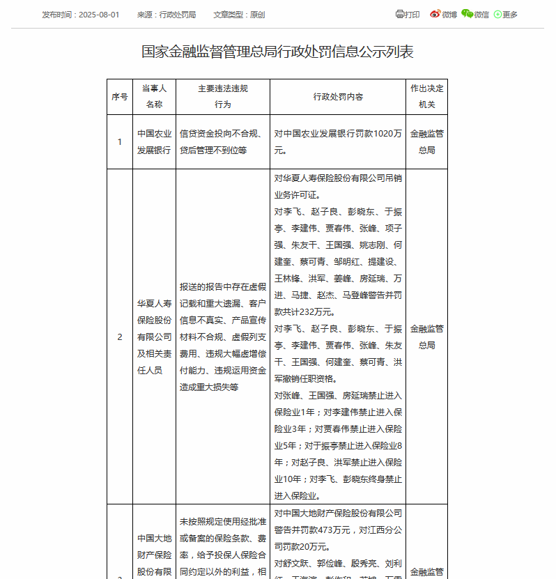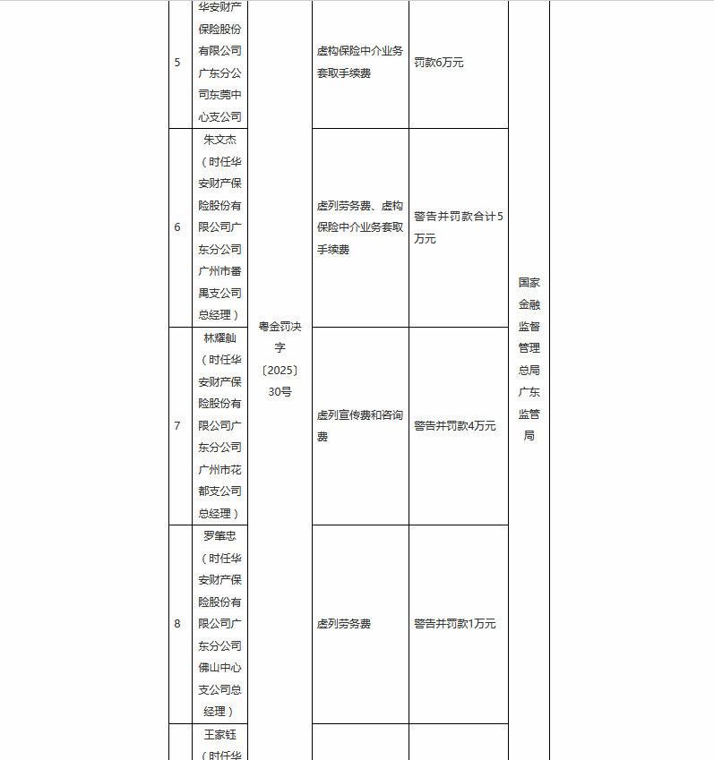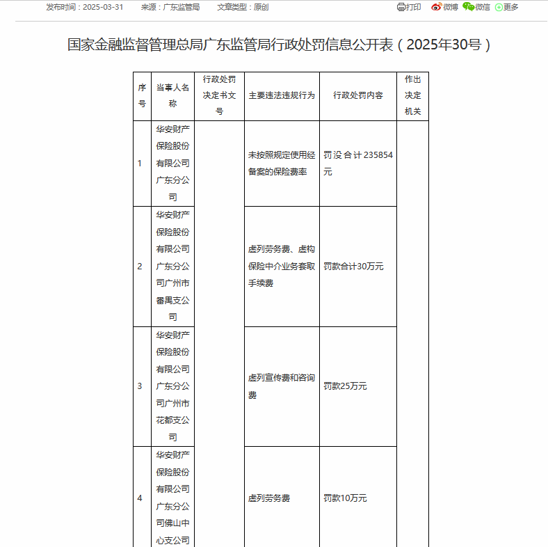 2025年罚单显示,多家险企因“报行不合一”受罚。2025年3月31日,国家金融监督管理总局广东监管局披露的行政处罚信息公开表(粤金罚决字〔2025〕30号)显示,华安财险多家分支机构及相关责任人因“报行不合一”等集中被罚。其中,华安财险广东分公司因未按照规定使用经备案的保险费率,被罚没合计23.5854万元;华安财险广州市番禺支公司因虚列劳务费、虚构保险中介业务套取手续费,被罚款合计30万元;华安财险广州市花都支公司因虚列宣传费和咨询费,被罚款25万元;华安财险佛山中心支公司因虚列劳务费,被罚款10万元;华安财险东莞中心支公司因虚构保险中介业务套取手续费,被罚款6万元。同时,还有多位相关责任人被罚。