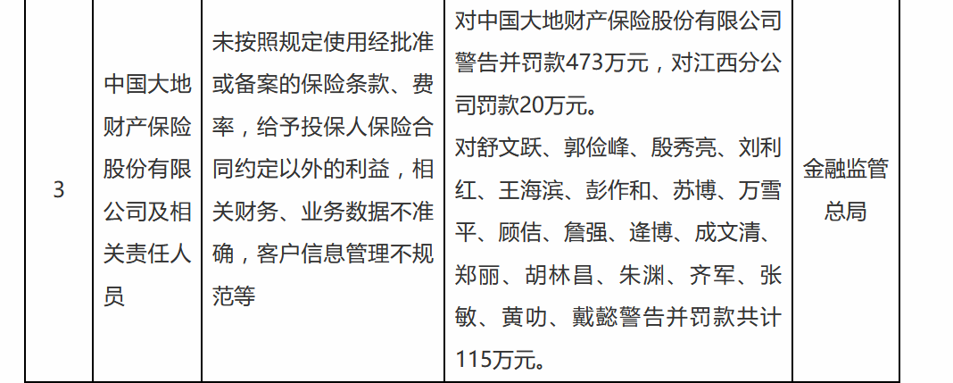 此外,大地财险、天安财险等也收下百万元级罚款。2025年8月1日,国家金融监督管理总局披露的行政处罚信息公示表显示,中国大地财产保险及相关责任人员,因未按照规定使用经批准或备案的保险条款、费率,给予投保人保险合同约定以外的利益,相关财务、业务数据不准确,客户信息管理不规范等,被警告并罚款473万元;江西分公司被罚款20万元;19名相关责任人被警告并罚款共计115万元。