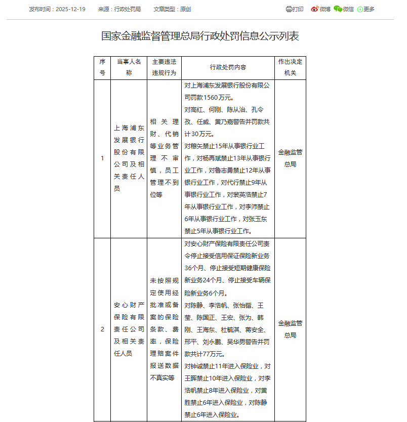 安心财险也因存在未按照规定使用经批准或备案的保险条款、费率等,被监管部门处罚。2025年12月19日,国家金融监督管理总局发布了对安心财险的罚单。罚单显示,安心财险存在未按照规定使用经批准或备案的保险条款、费率,保险理赔案件报送数据不真实等主要违法违规行为。安心财险被停止接受信用保证保险新业务36个月、停止接受短期健康保险新业务24个月、停止接受车辆保险新业务6个月。同时,其14名相关责任人被警告并罚款共计77万元,5名相关责任人被禁止6~11年进入保险业。