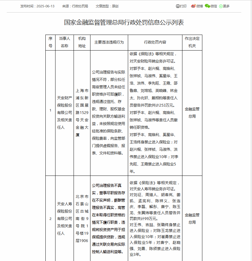 2025年6月13日,国家金融监督管理总局对天安财险及相关责任人开出罚单。罚单显示,天安财险存在的违法违规行为:公司治理报告与实际情况不符,部分拟任高级管理人员未经任职资格许可即履职,违规通过信托、存款、理财、股权基金投资向关联方输送利益,未按照规定使用经批准的保险条款、保险费率,向监管部门提供虚假报告、报表、文件和资料等。依据相关规定,天安财险被吊销业务许可证,16名相关责任人被警告并罚款共计253万元,5名相关责任人被撤销任职资格,4名相关责任人被终身禁止进入保险业,4名相关责任人被禁止进入保险业10年,2名相关责任人被禁止进入保险业5年。