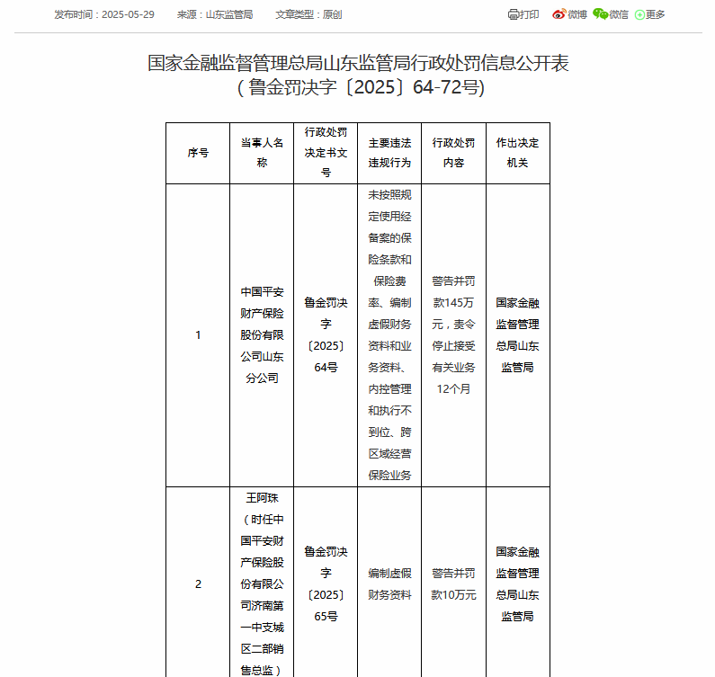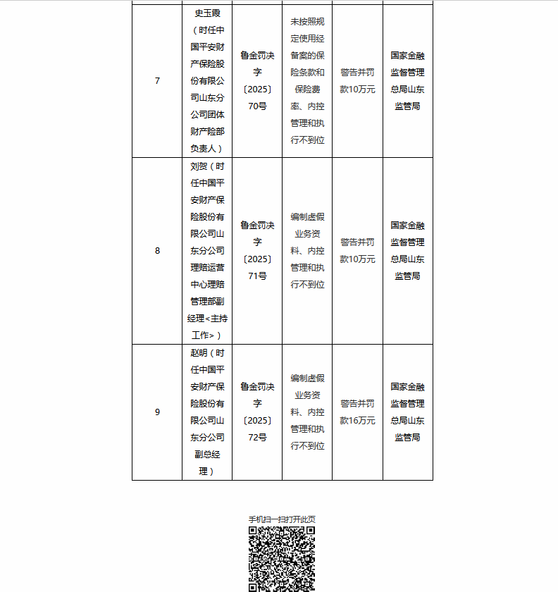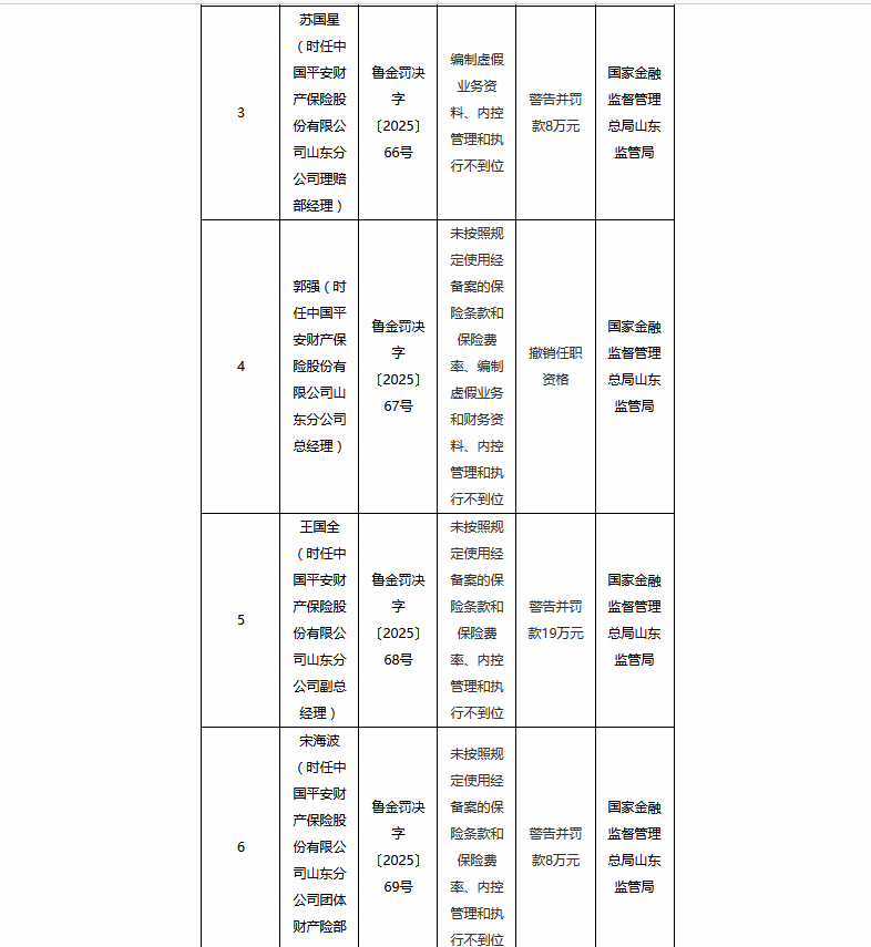 从罚没金额来看,平安财险山东分公司领到山东监管局2025年单笔罚款金额最大的罚单。根据山东监管局行政处罚信息公开表(鲁金罚决字〔2025〕64~72号),平安财险山东分公司因未按照规定使用经备案的保险条款和保险费率、编制虚假财务资料和业务资料、内控管理和执行不到位、跨区域经营保险业务,被警告并罚款145万元,被责令停止接受有关业务12个月。此外,7名相关责任人被警告并罚款8万~19万元,时任平安财险山东分公司总经理的郭强被撤销任职资格。