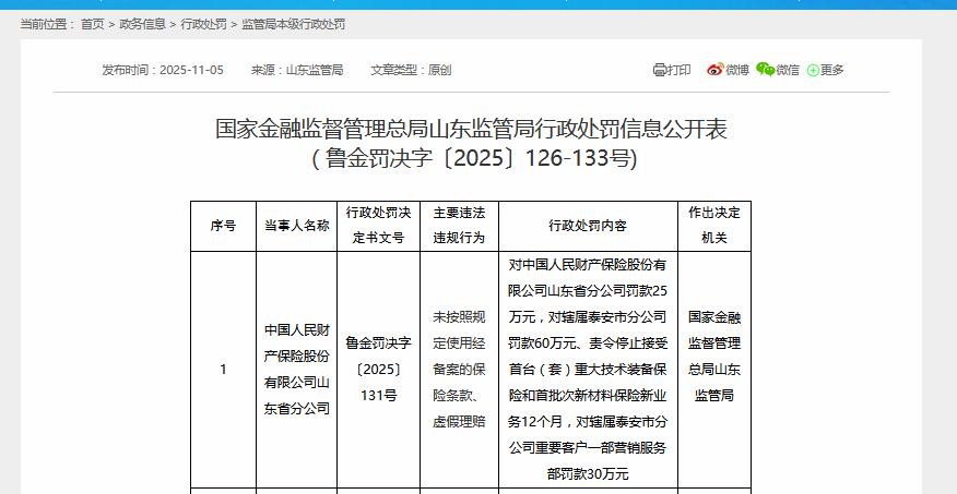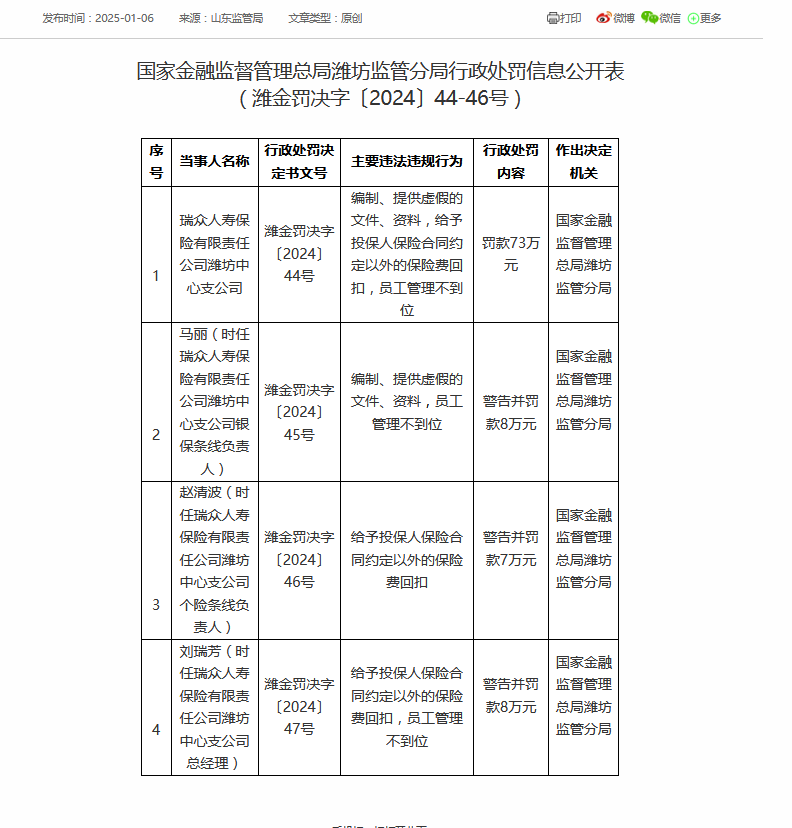 根据山东监管局行政处罚信息公开表(鲁金罚决字〔2025〕126号),人保财险山东省分公司因未按照规定使用经备案的保险条款、虚假理赔,被罚款25万元,辖属泰安市分公司被罚款60万元。此外,山东监管局责令人保财险山东省分公司停止接受首台(套)重大技术装备保险和首批次新材料保险新业务12个月,对辖属泰安市分公司重要客户一部营销服务部罚款30万元。根据国家金融监督管理总局潍坊监管分局行政处罚信息公开表(潍金罚决字〔2024〕44~46号),因编制、提供虚假的文件、资料,给予投保人保险合同约定以外的保险费回扣,员工管理不到位,瑞众人寿潍坊中心支公司被罚款73万元;3名相关责任人被警告并罚款7万~8万元。