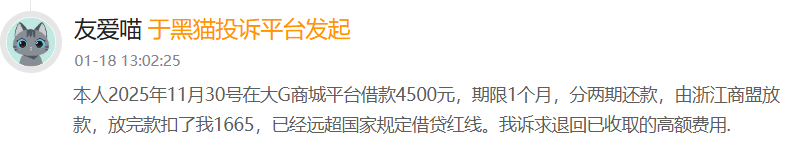 “本人于2025年12月在智惠融APP借款6笔,分别是两笔3600元、两笔4000元、两笔4500元,并于2026年1月15日通过银钱罐APP借款6000元,所有借款均分2期偿还,除支付利息外,四笔贷款居间服务费分别高达1260元、1400元、1570元、2360元。现要求浙江商盟商务服务有限公司退回融担费以及‘砍头息’形式的担保费。”1月25日,一网友在投诉平台提出控诉。