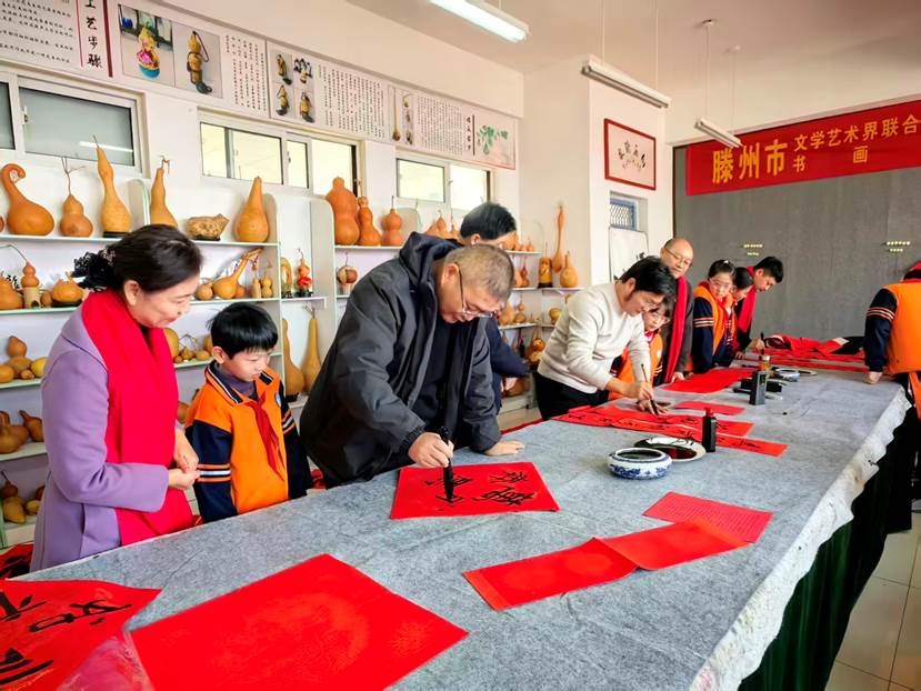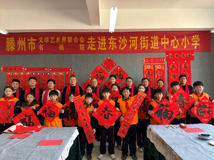 为深入贯彻落实国家文化惠民政策,扎实推进中华优秀传统文化进校园、进课堂、进心灵,近日,滕州市文学艺术界联合会、滕州书画院联合组织多名书画名家,走进东沙河街道中心小学,开展“新春送万福进校园”主题活动,为全校师生送上浓浓的新春祝福与文化滋养。