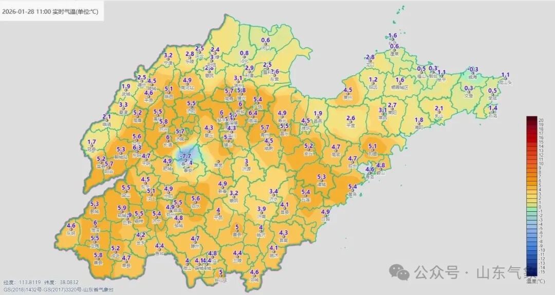 29日最高气温:鲁西北地区和鲁中山区3℃左右,烟台和威海0℃左右,其他地区7℃左右。