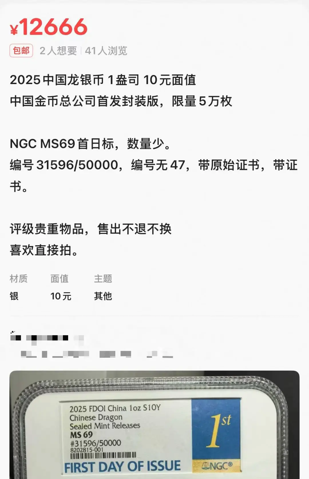 引人注目的是,有商家标价1.26万元销售一枚“10元面额2025版中国龙银质纪念币”。记者以消费者身份咨询该商家,对方表示,该款是“中国金币总公司首发封装版,限量5万枚”,并称1.26万元已是市场低价。