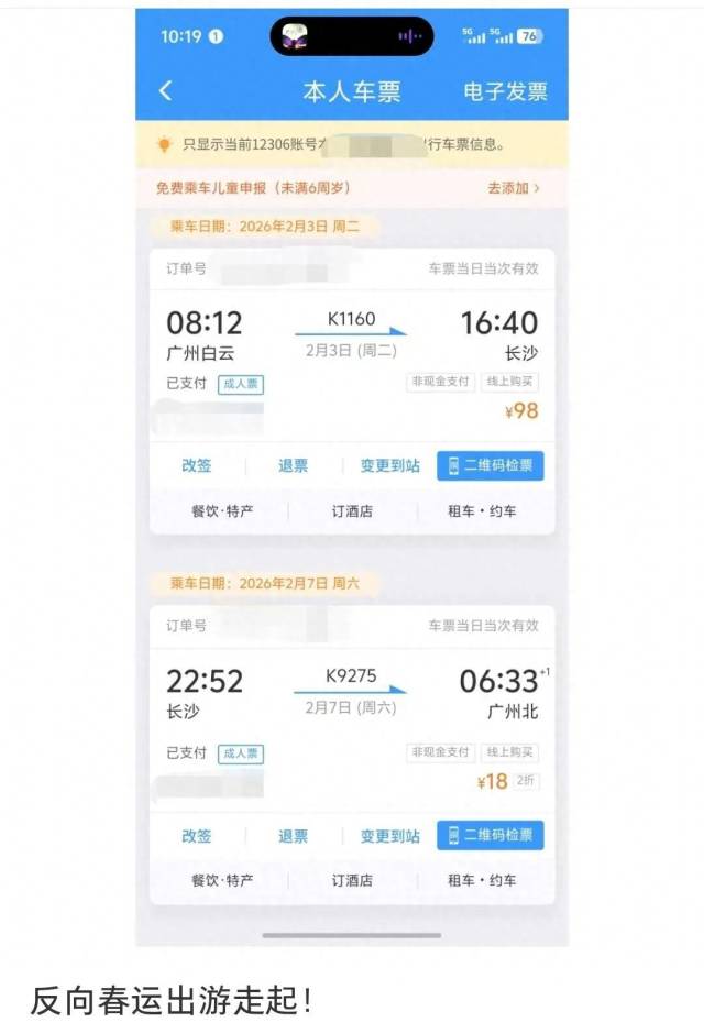 此外,部分跨省的长途车次也享受同样力度的优惠。广州陈女士(化姓)在社交平台晒出自己在春运期间出游的往返车票,其打算2月3日和朋友从广州到长沙游玩,7日从长沙回归老家广州过年,去程票价98元,回程票仅18元。