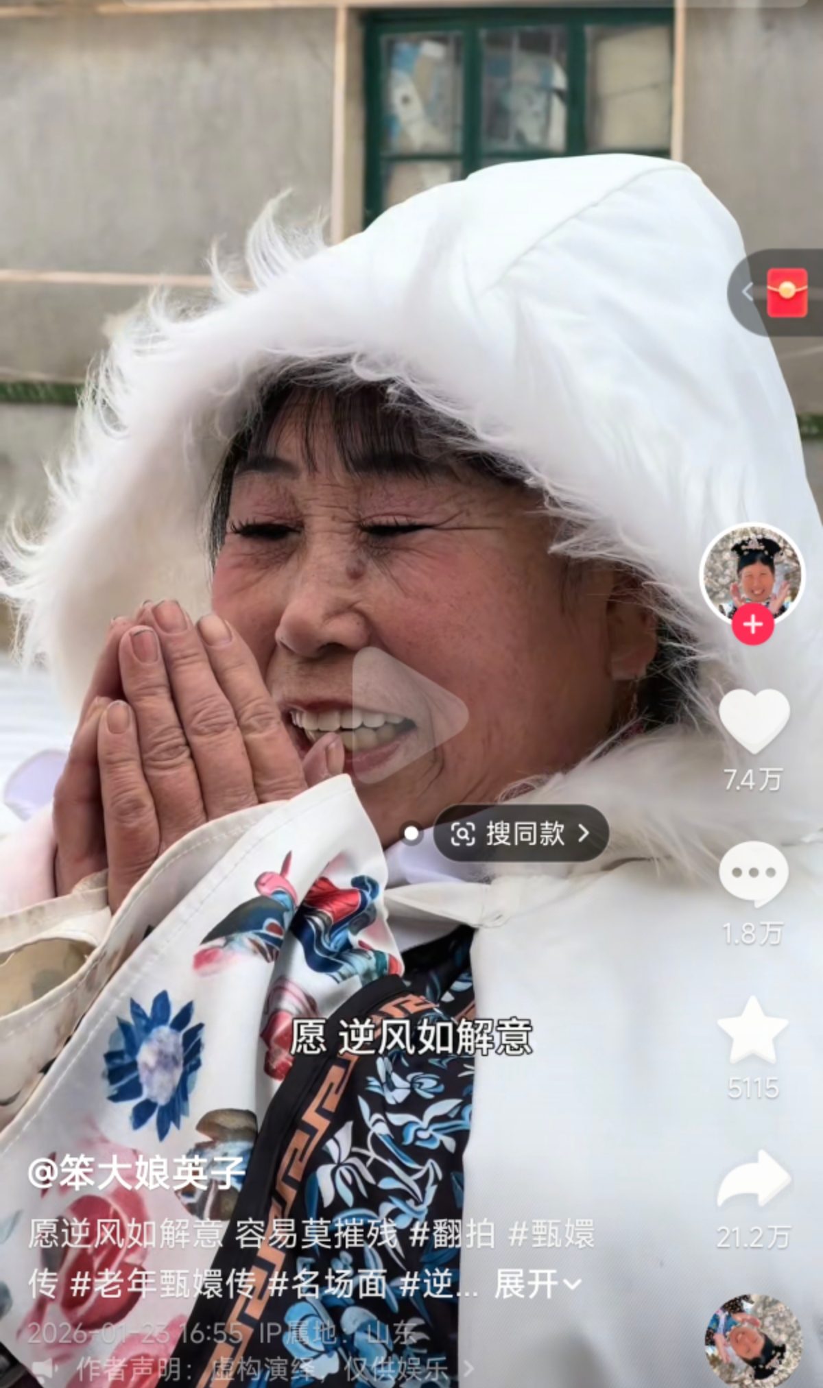 当68岁的青岛大姨操着地道方言,在农家小院里演绎甄嬛名场面,床单作旗装、塑料花当旗头,菜园子变御花园,这份带着乡土烟火气的创作,不仅让大姨和老姐妹们收获百万粉丝,更让这场“土味甄嬛传”成为全网刷屏的网络热点。详情>>