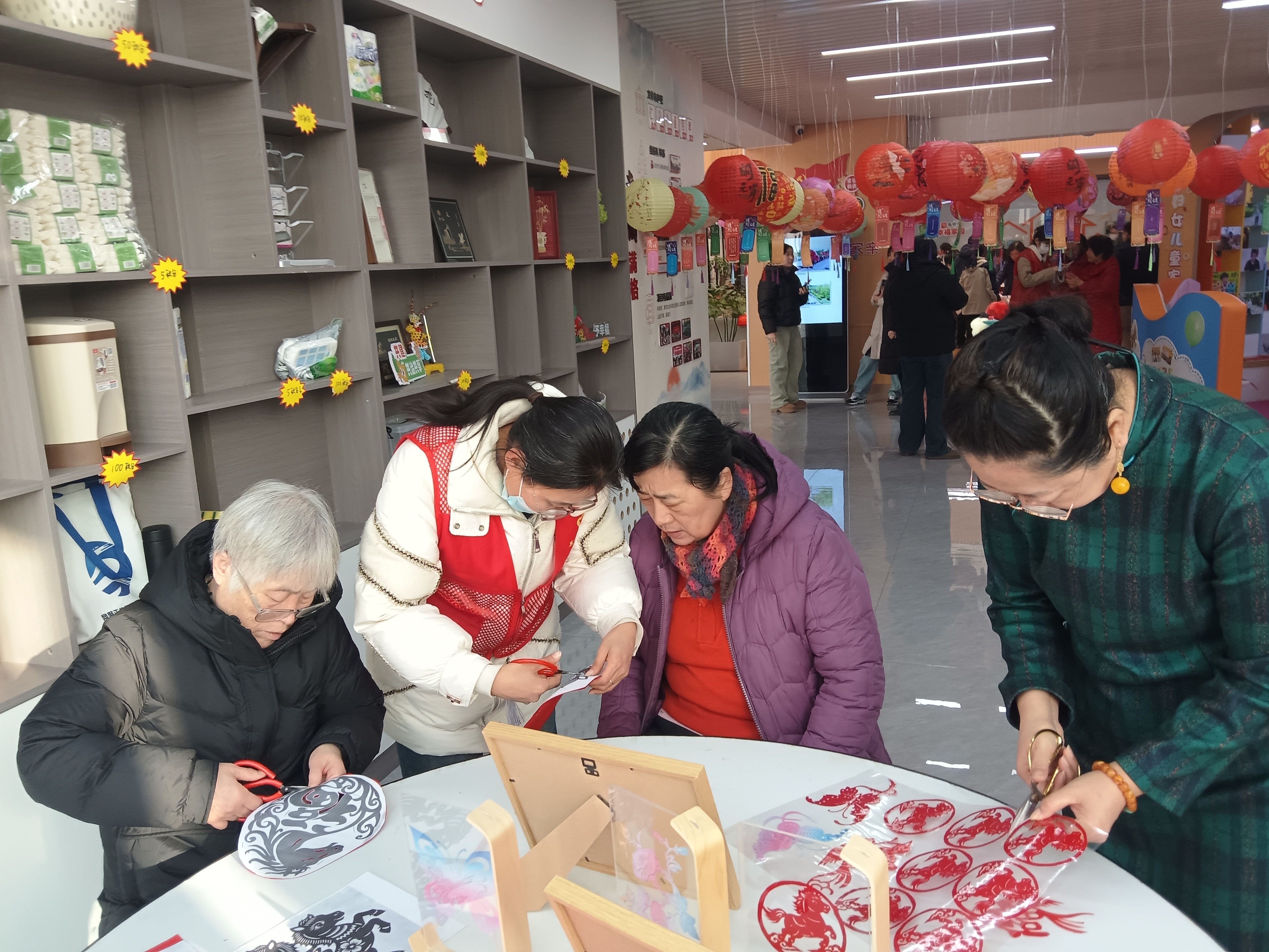 “非遗巧艺·窗花添喜”环节备受青睐,非遗传承人现场展示剪纸绝技,一把剪刀在手中灵活翻飞,转眼间,马年生肖、吉祥纹样、文明主题等各式精美的窗花便应运而生。居民们热情高涨,纷纷围在传承人身边请教学习,志愿者全程提供耐心指导。大家一手持纸、一手握剪,认真裁剪,虽然手法略显生疏,但专注的神情丝毫不减。剪好的窗花经过现场封塑处理,既可以带回家装点门窗,增添年味,部分优秀作品还将参与社区巡展或公益赠予,让非遗文化在邻里间流转传承。