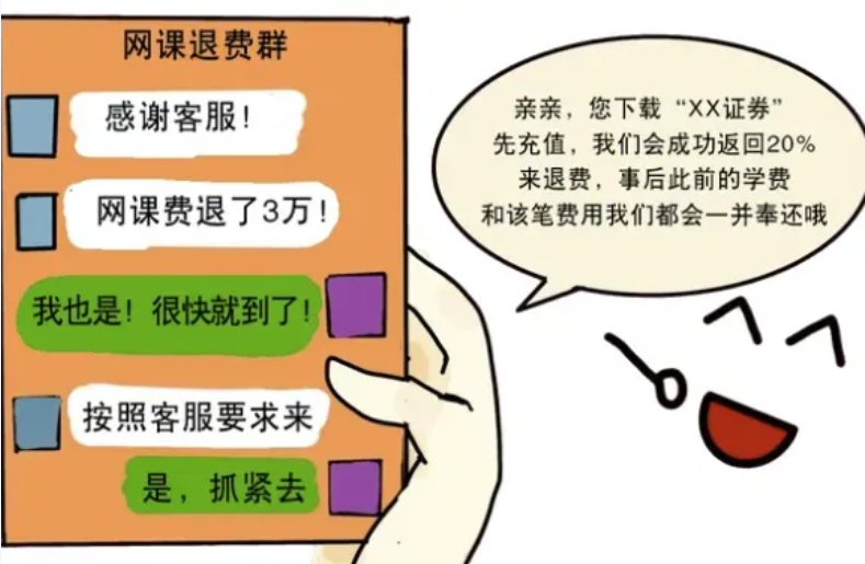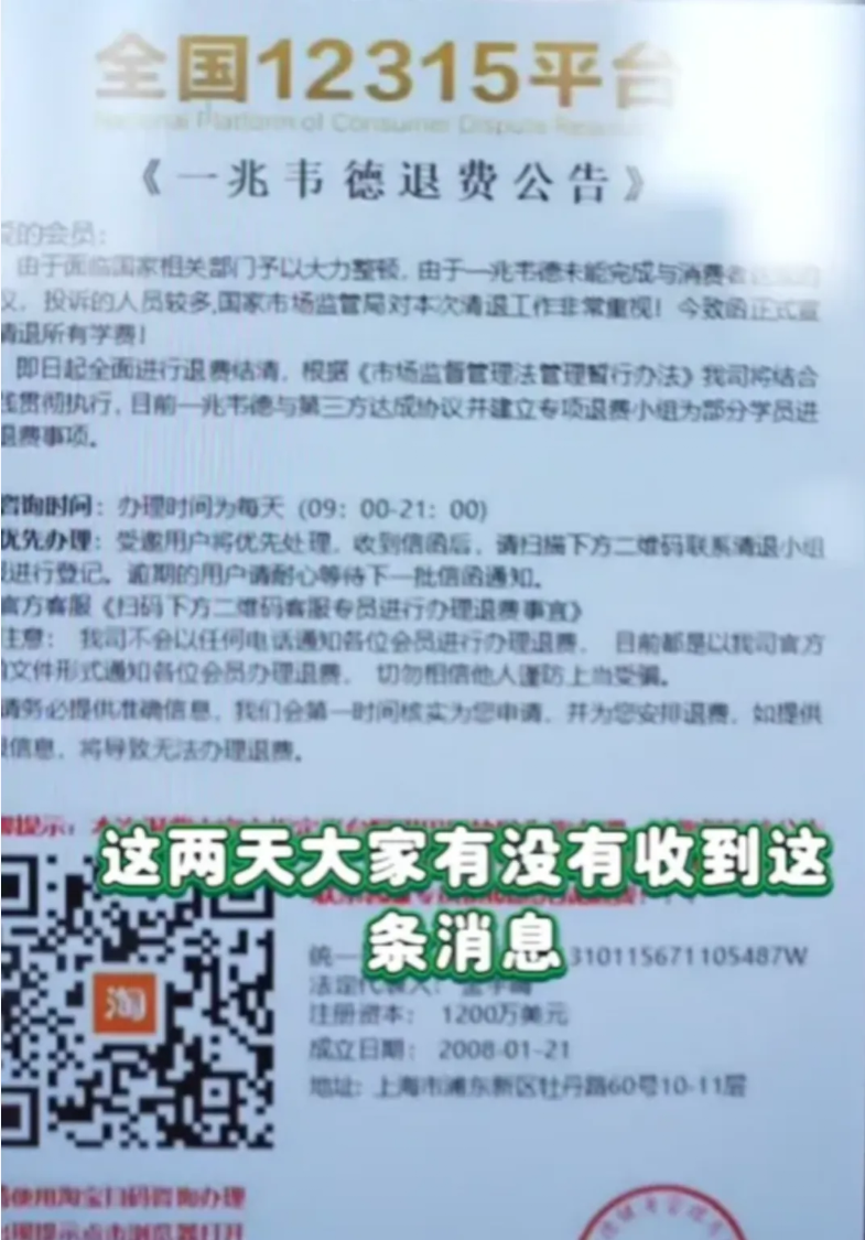 A市民收到顶端标有“全国12315平台”醒目字样的短信图片,标题为《一兆韦德退费公告》,声称清退学费。该市民联系“客服专员”后,被以“购买理财产品退费”“充值返利”“做任务”等名义骗走1.5万余元。