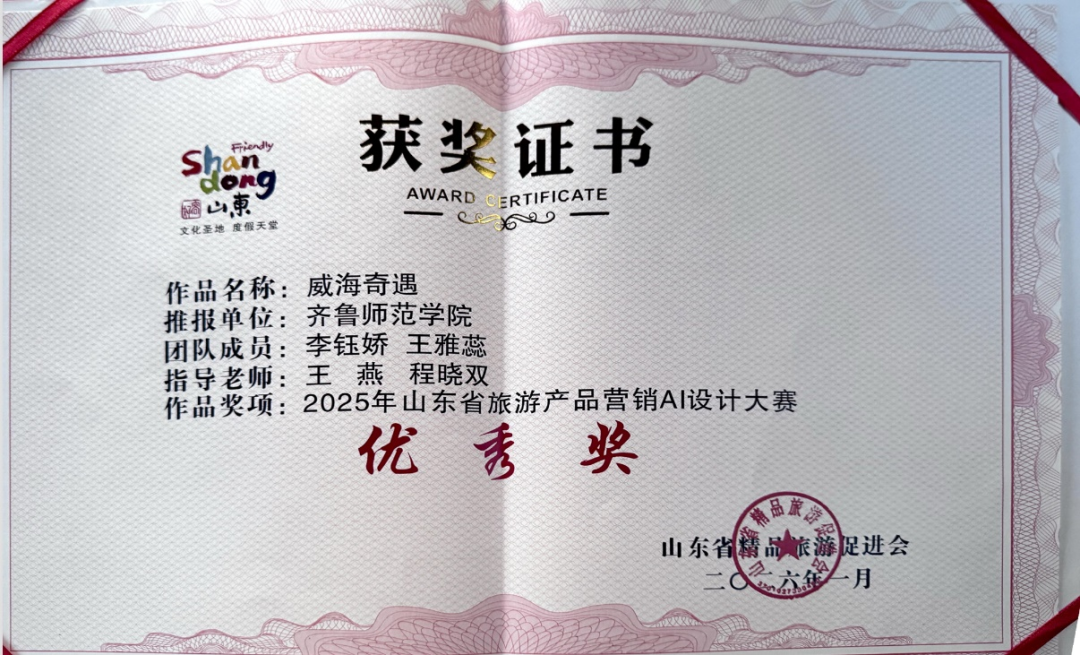在2025年第一届山东省旅游产品营销AI设计大赛中,学院师生紧扣文旅数智化发展趋势,5项作品脱颖而出。其中,2024级旅游管理专业高紫涵、王明燕团队的作品《锦绣前程·齐鲁行》作品,紧密围绕山东省文旅业前沿热点展开策划,巧妙融合人工智能技术手段,凭借独具匠心的创意与精妙的设计,在相关赛事中荣获二等奖。其余4项作品获得优秀奖,集中展现学院专业数智文创教学的丰硕成果。