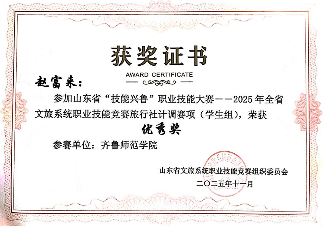 在2025年山东省“技能兴鲁”职业技能大赛旅行社计调赛项(学生组)中,2024级旅游管理专业于芙文、赵富来同学凭借扎实的专业理论基础与素养,分别获得二等奖、优秀奖。