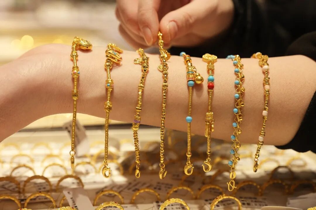 2026年1月28日,浙江杭州,首饰店铺员工在整理黄金首饰。中新社发 小绍兴 摄