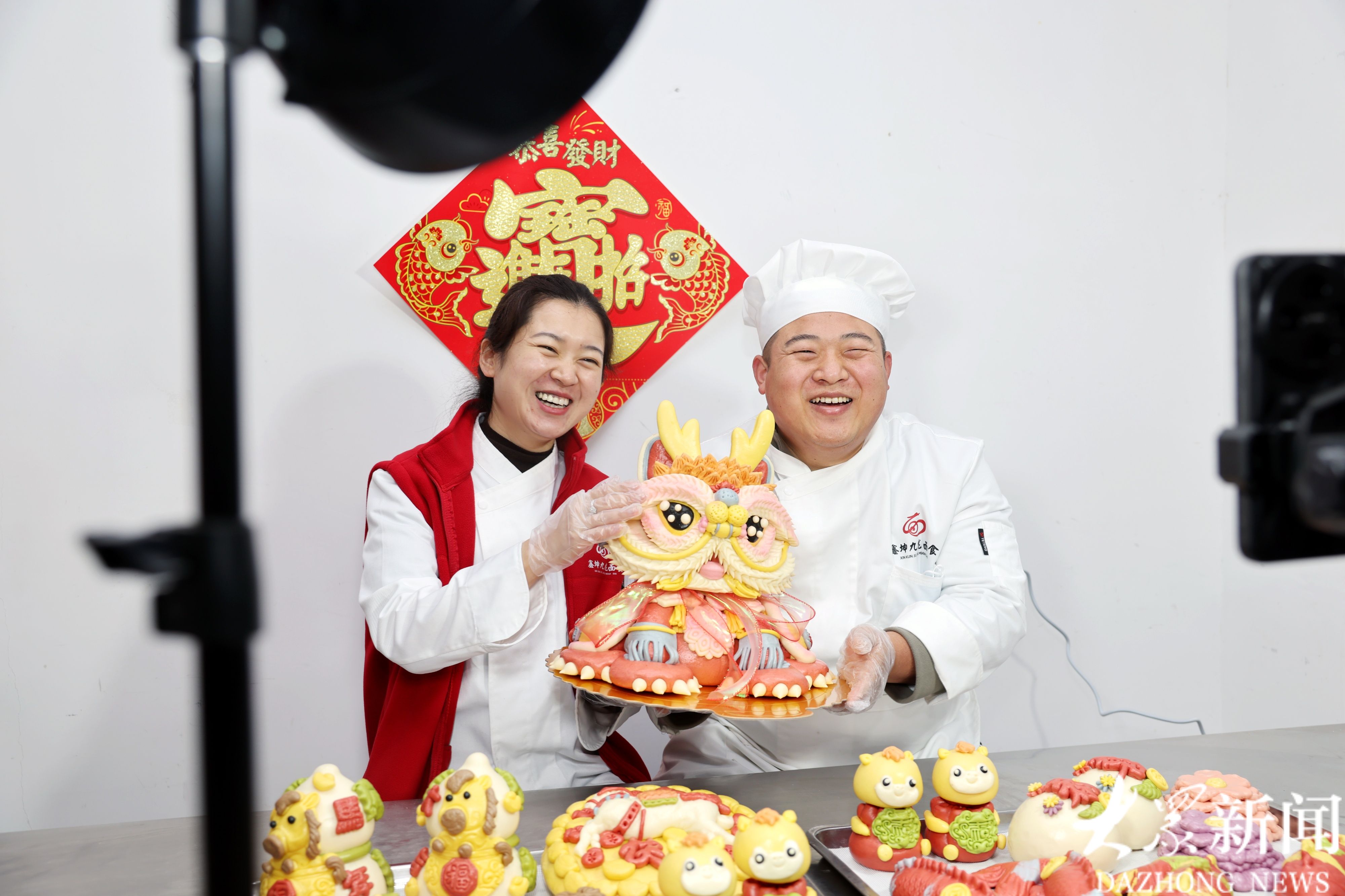 胶州市九龙街道大闹埠村,非遗花馍传承人黑尤坤(右)与妻子杨鑫在网络平台直播推荐“大舞狮”花馍。