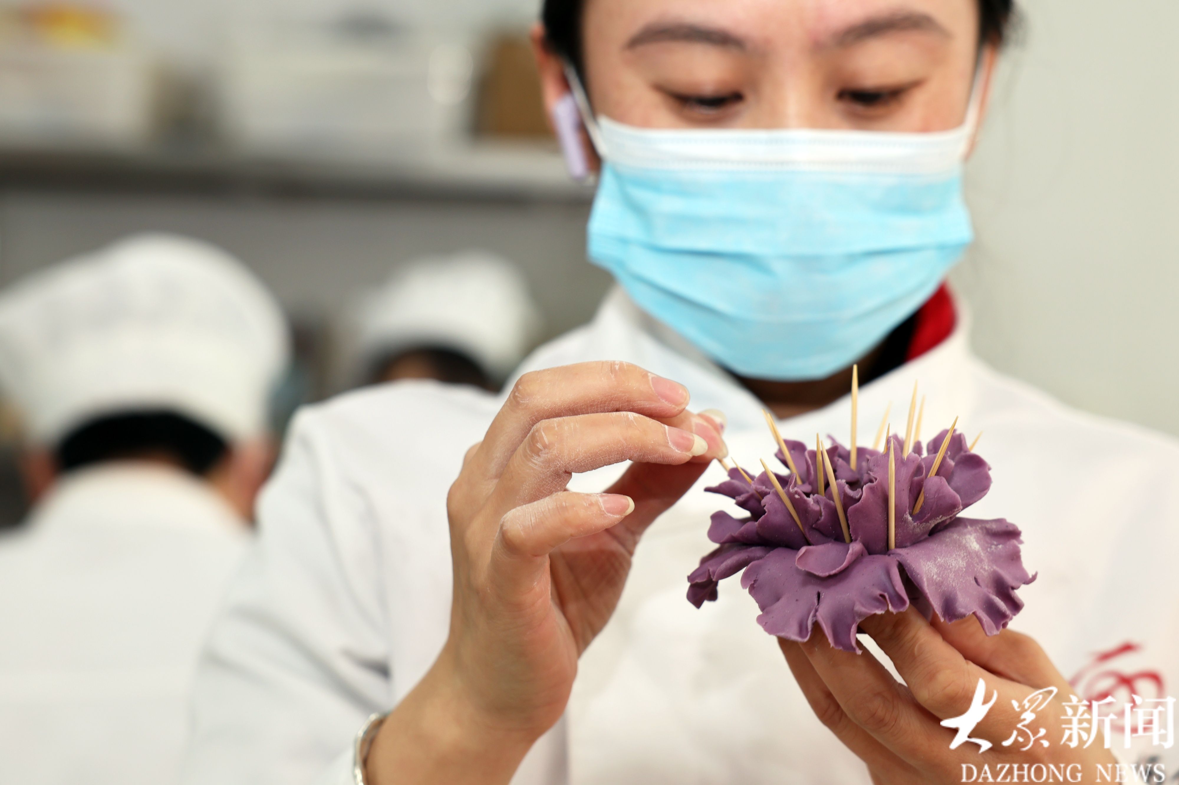 女工刘梅在成型的牡丹花馍上插牙签,防止其在蒸制过程中变形。刘梅2020年开始在花馍车间工作,她技术全面,能拿到工人里面最高的月工资。
