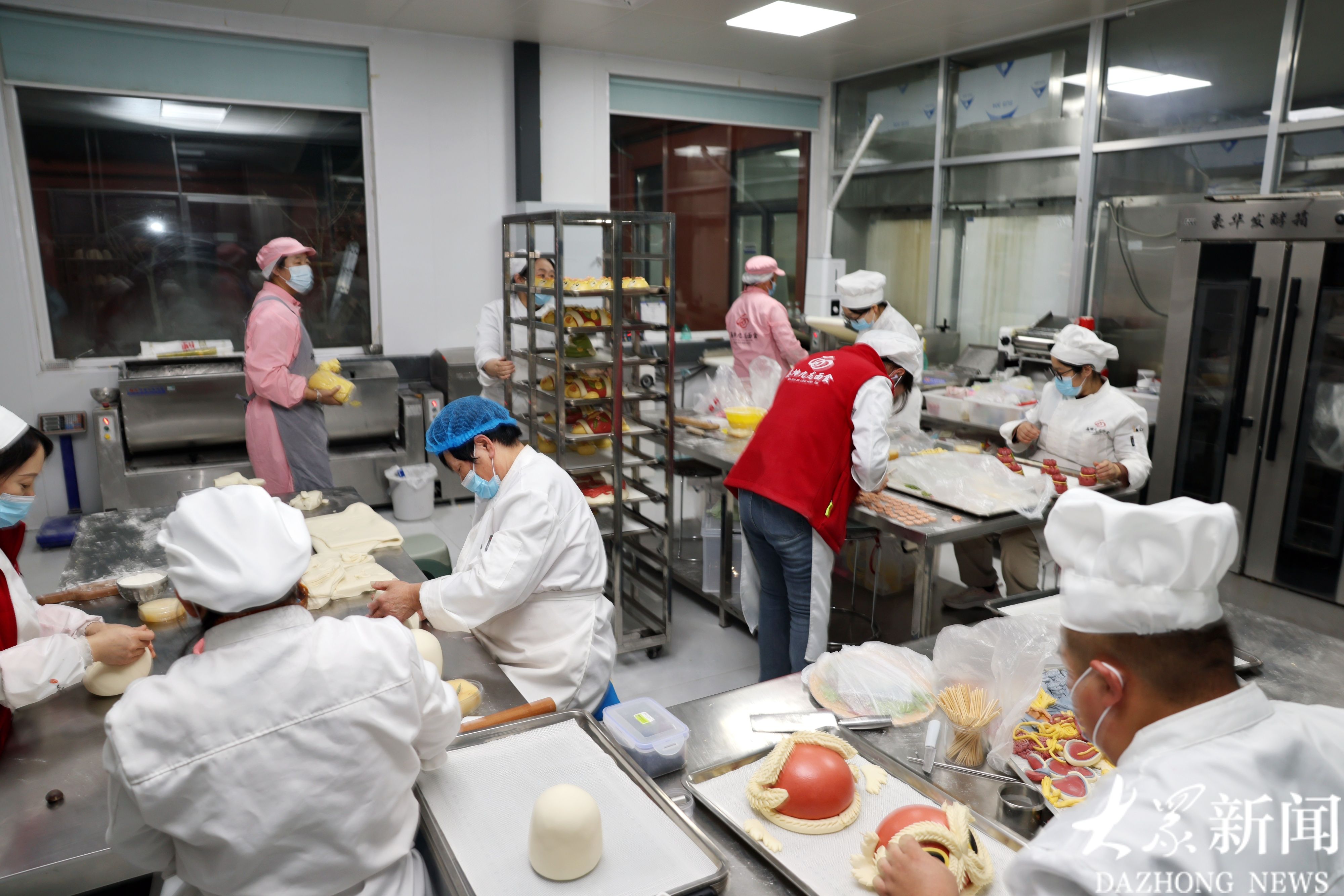 “春节前这个月是(一年中)最忙的,加班费高,工人能拿到7000到10000元。”杨鑫说,此时下午5点半,天已黑下来了,室外天寒地冻,车间内明亮温暖,桌案机器整洁。黑尤坤和11名女工埋头制作花馒,偶尔有人起身去补充物料、把花馍摆满的货架车推到隔壁车间醒发、蒸制。