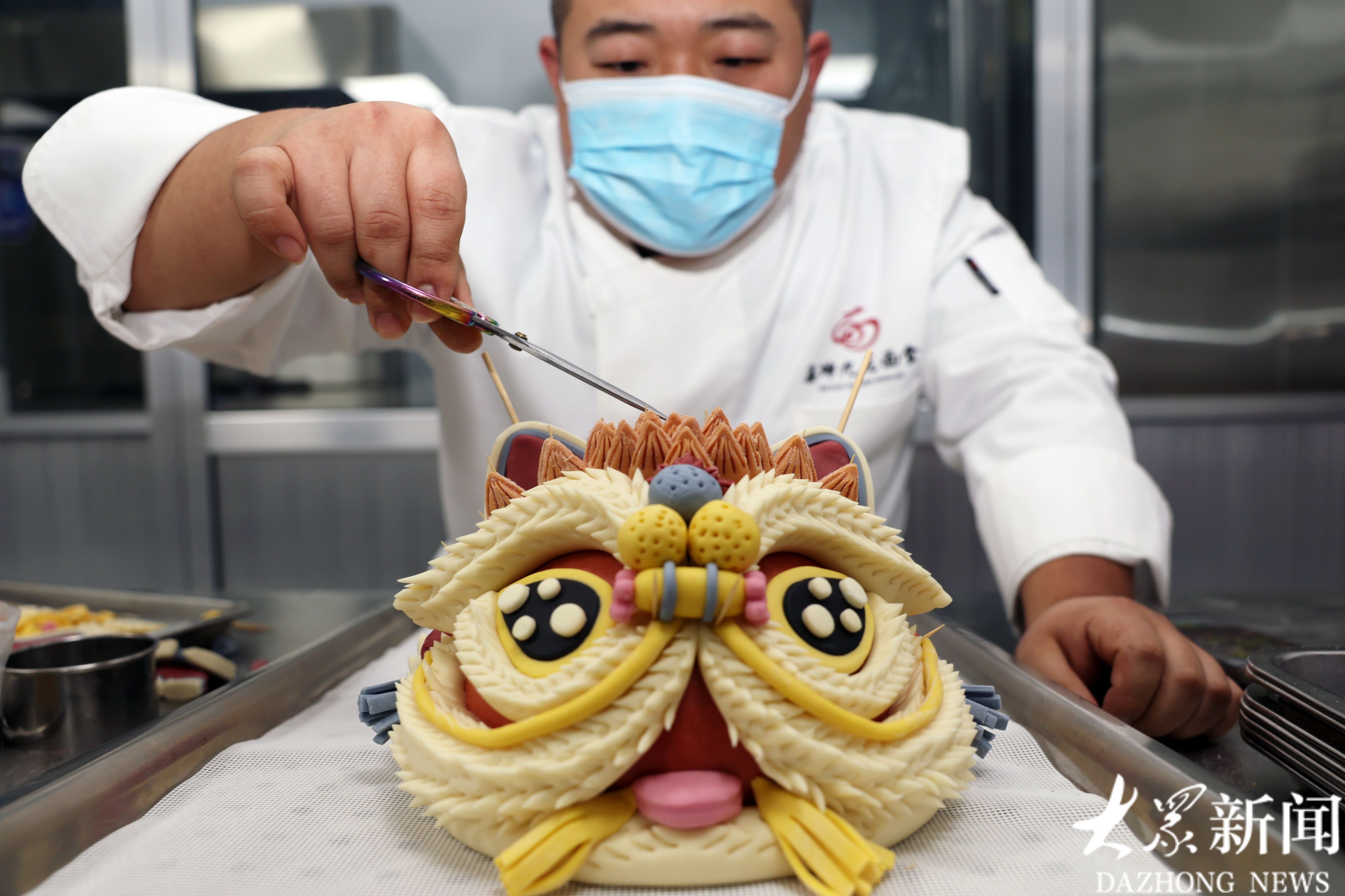 黑尤坤为半成品的大舞狮花馍修剪“发型”,手工塑形是花馍制作的关键工序。