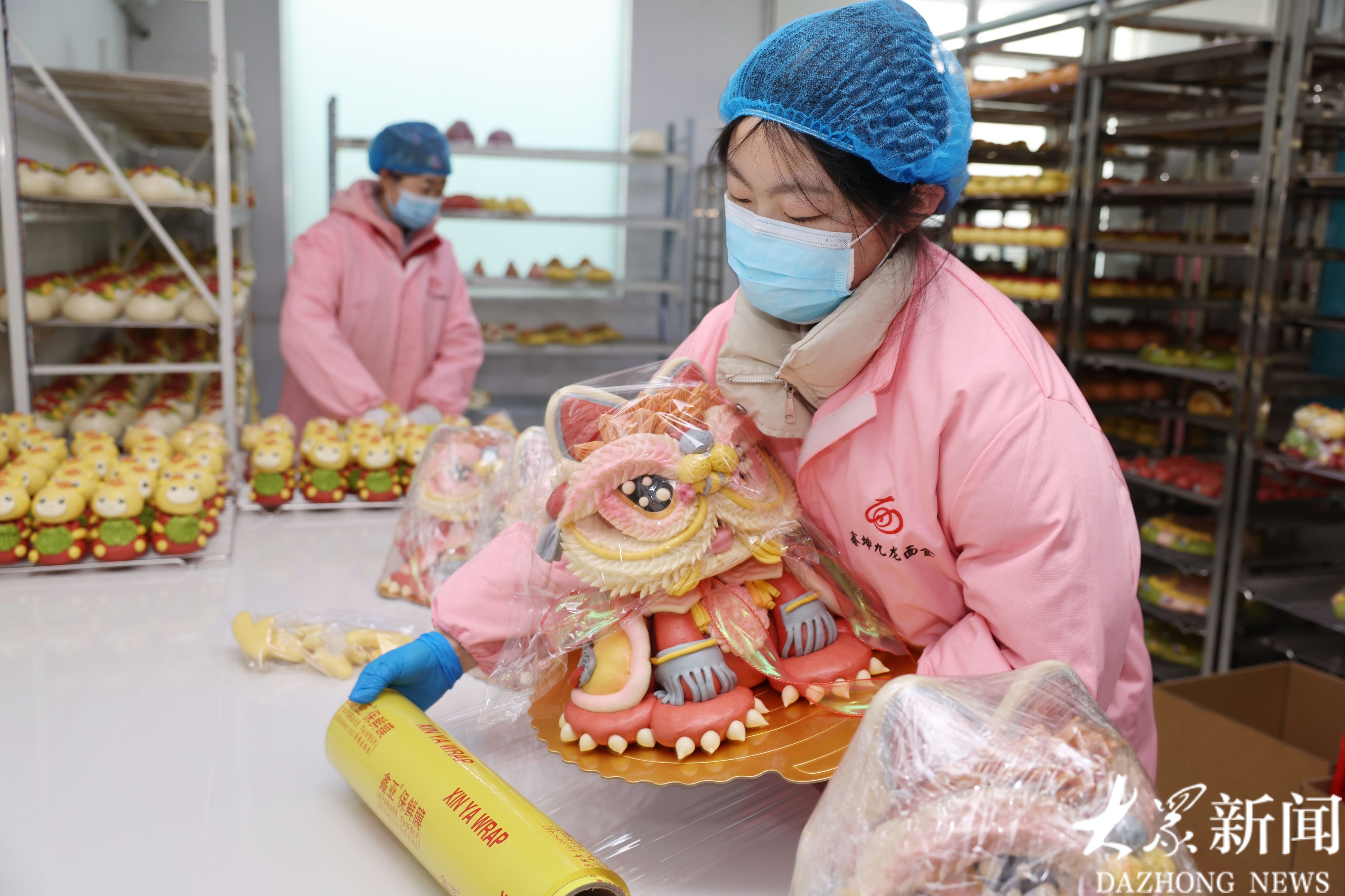 隋佳蓉为大舞狮花馍包装保鲜膜,她大学曾在黑尤坤的花馍车间实习,毕业后来此就业。