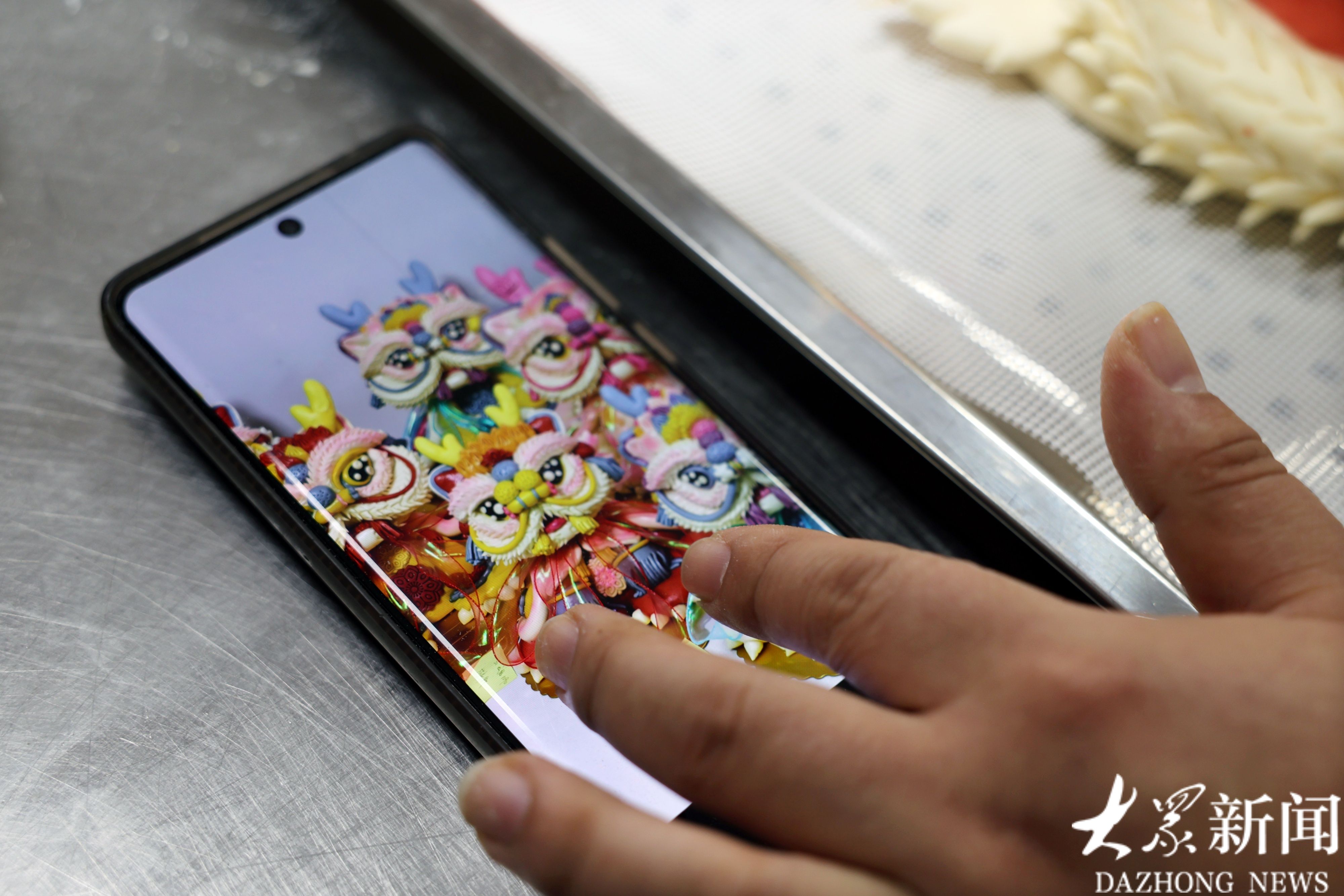 黑尤坤参照手机上的图片,对“大舞狮”花馍进行塑形。