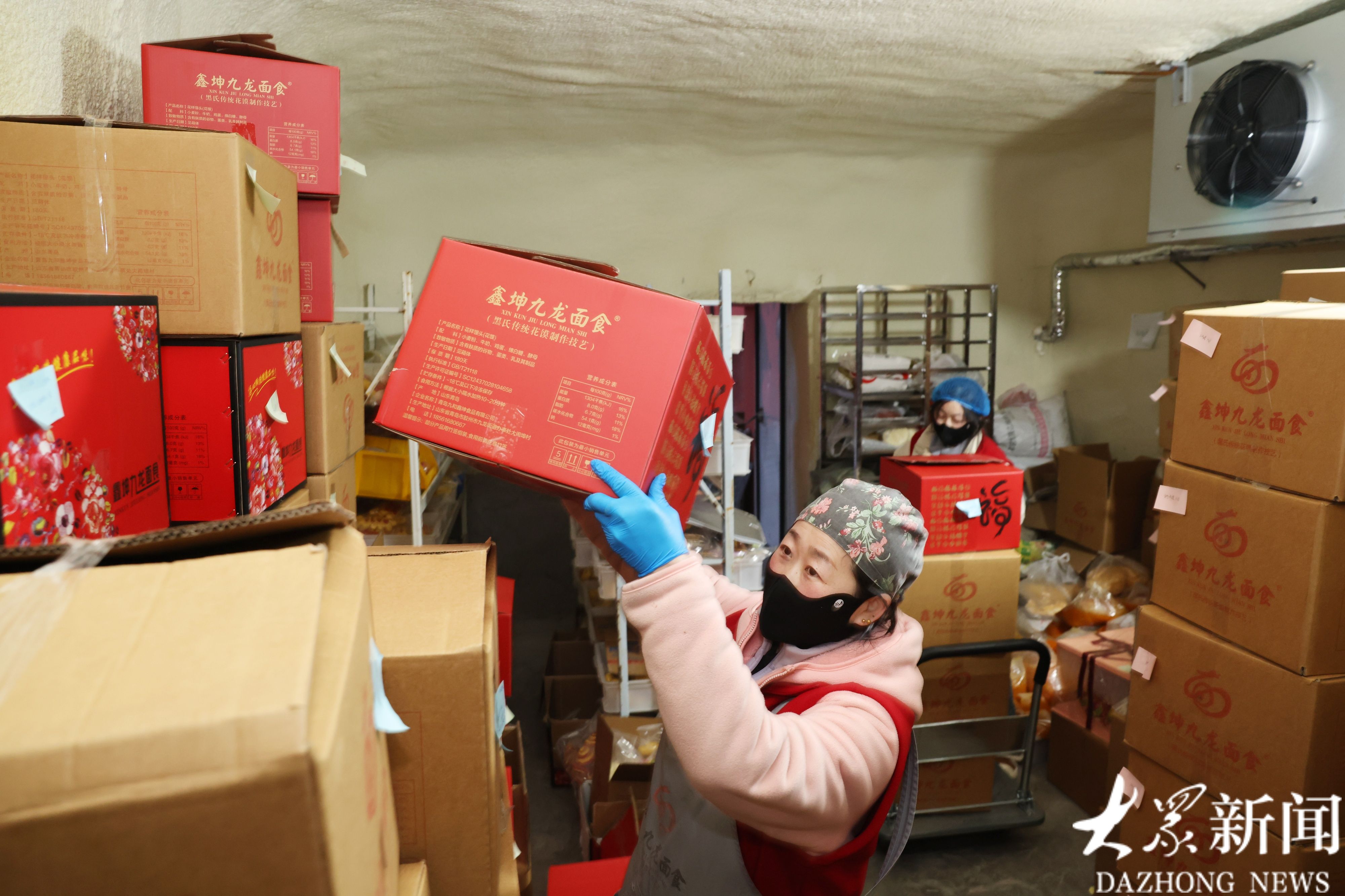 工人李瑞在冷库里码发装箱等待发货的花馍,这样的冷库九和鑫坤公司有两个。李瑞今年40岁,是两个孩子的母亲。