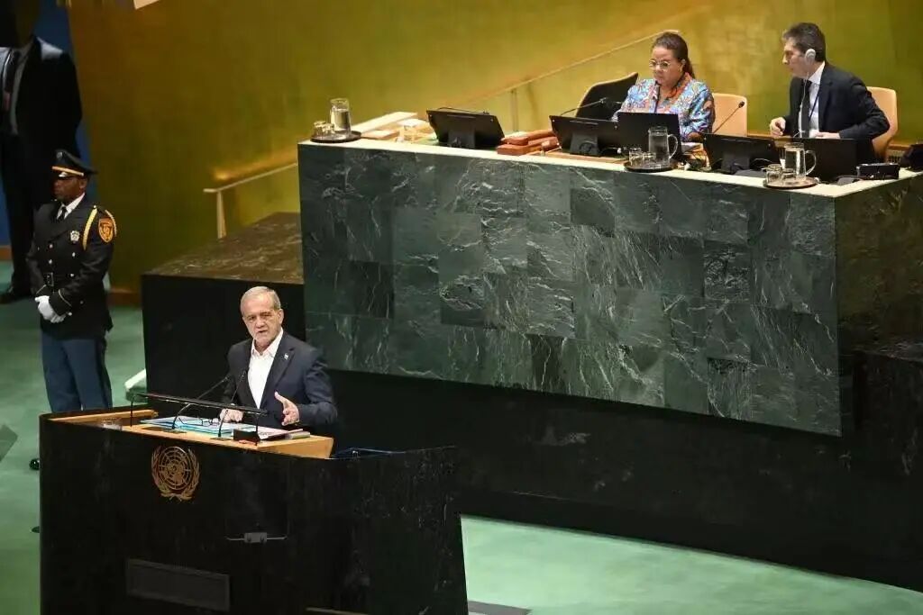 图片当地时间2025年9月24日,纽约联合国总部,伊朗总统佩泽希齐扬在第80届联合国大会一般性辩论中发言。中新社记者 陈孟统 摄