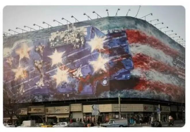 在伊朗首都德黑兰市中心,伊朗竖起巨幅宣传画:一艘美军航母被炸,血水流入大海,配文“煽风者将得到风暴”。
