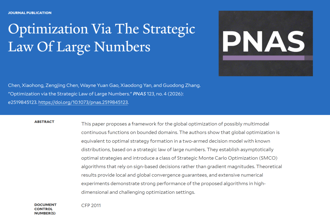 2026年1月,山东财经大学统计与数学学院预聘制教授张国栋作为同等贡献共同作者,与美国耶鲁大学Xiaohong Chen教授、山东大学陈增敬教授、美国宾夕法尼亚大学Wayne Yuan Gao教授、西安交通大学严晓东教授合作撰写的学术论文“Optimization Via The Strategic Law Of Large Numbers”,在国际顶级学术期刊《美国科学院院刊》(PNAS)正式发表。