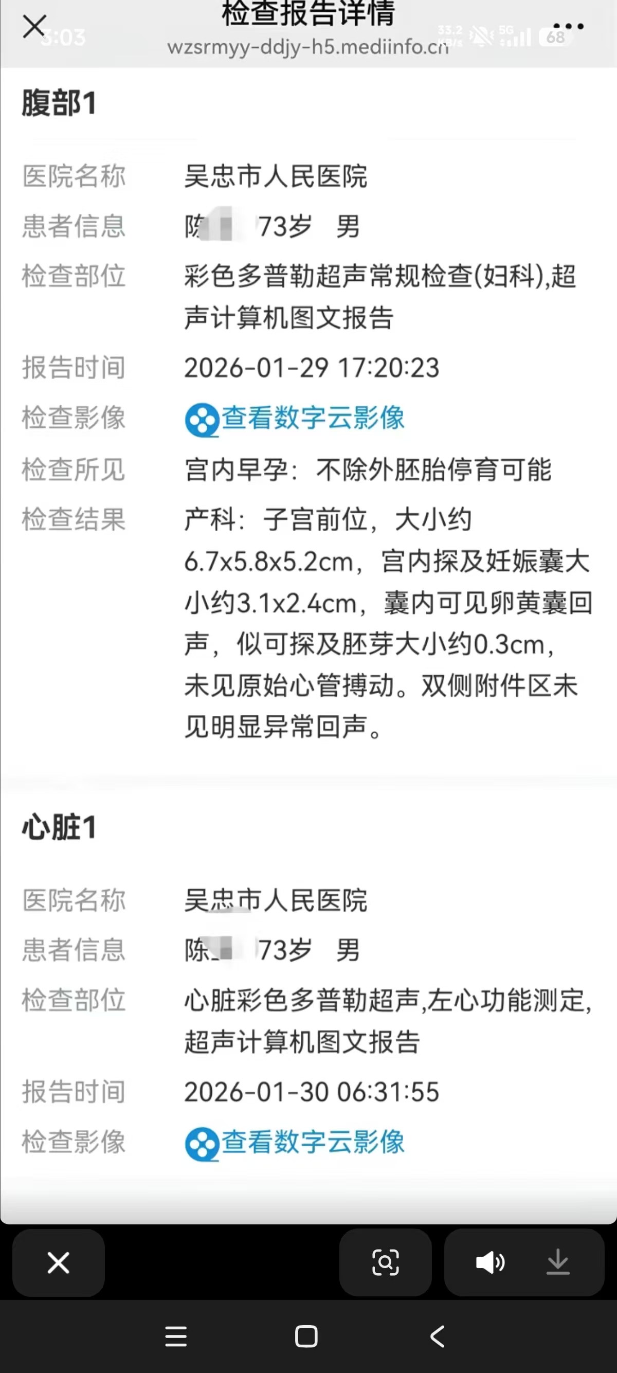 1月30日,有网友发文称,他同事73岁的老父亲前几天心脏不适到宁夏吴忠市人民医院检查,超声检查结果显示:宫内早孕,不排除胚胎停育可能。