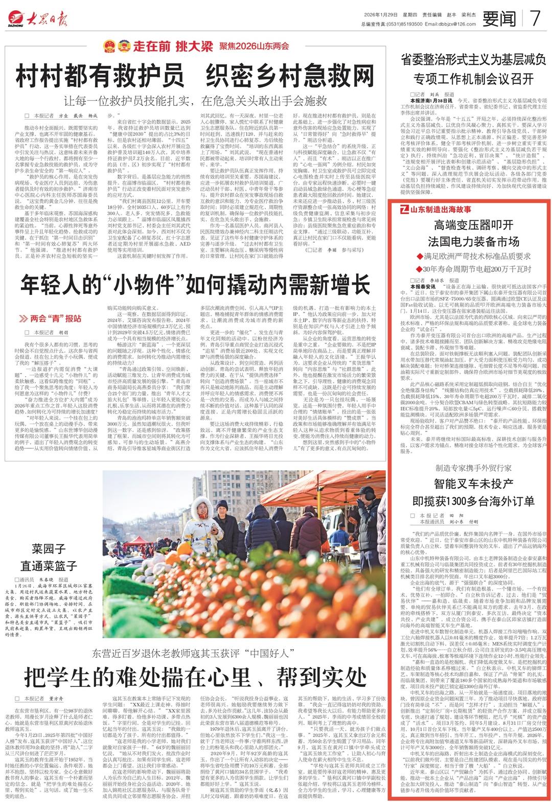 1月29日,7版要闻分别刊发《高端变压器叩开法国电力装备市场》,《智能叉车未投产即揽获1300多台海外订单》,报道来自泰安的山东泰开变压器有限公司、山东中机特种装备有限公司凭借科技创新,成功闯入海外市场。详情请点击这里—