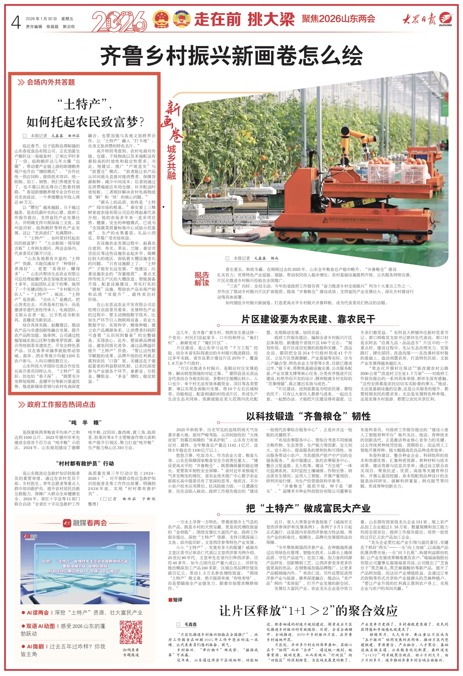 1月30日,4版要闻“聚焦山东两会”栏目刊发《“土特产”,如何托起农民致富梦?》,报道泰安爱上三棵树家庭农场有限公司总经理赵森代表关于设施农业建议。详情请点击这里—