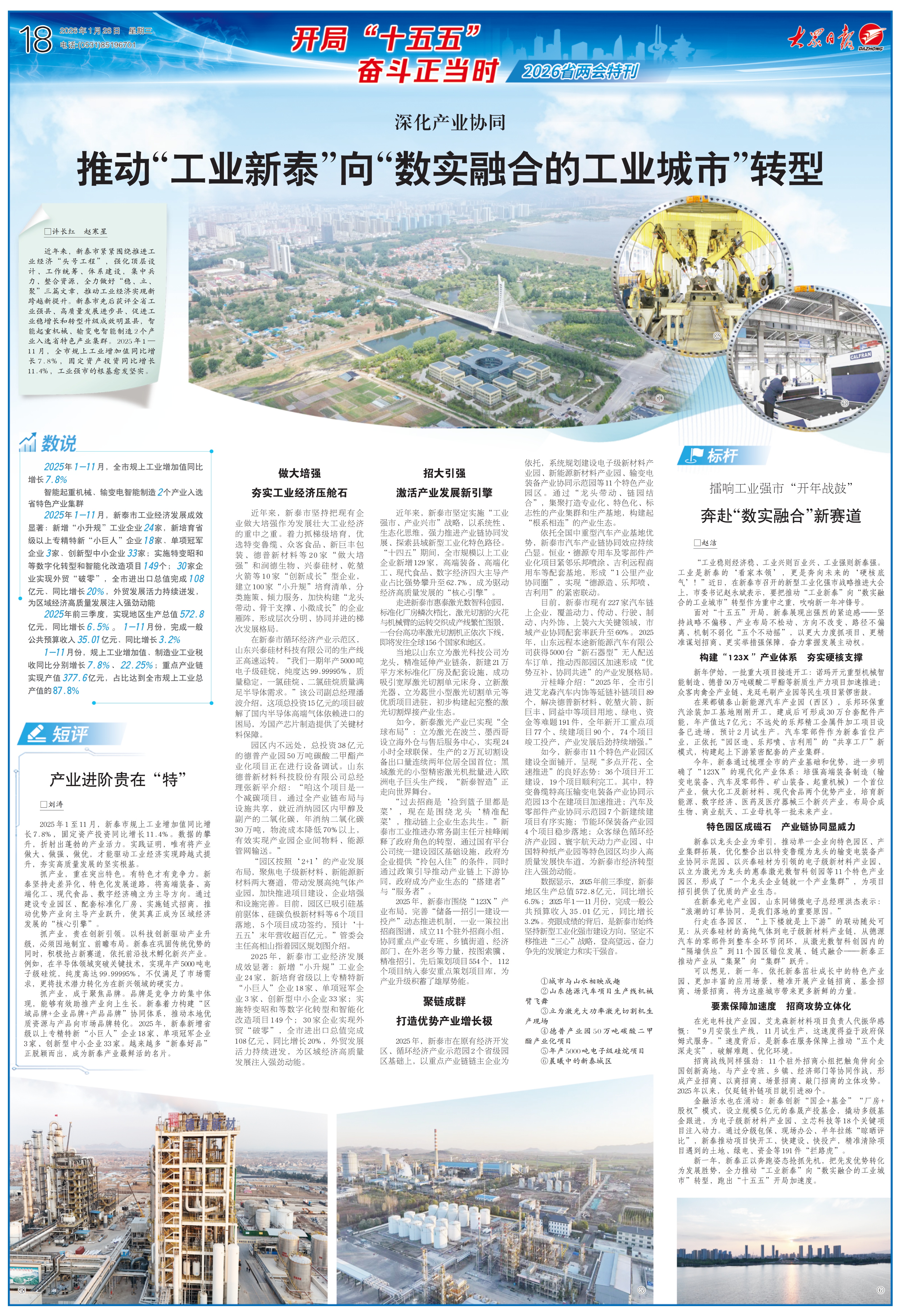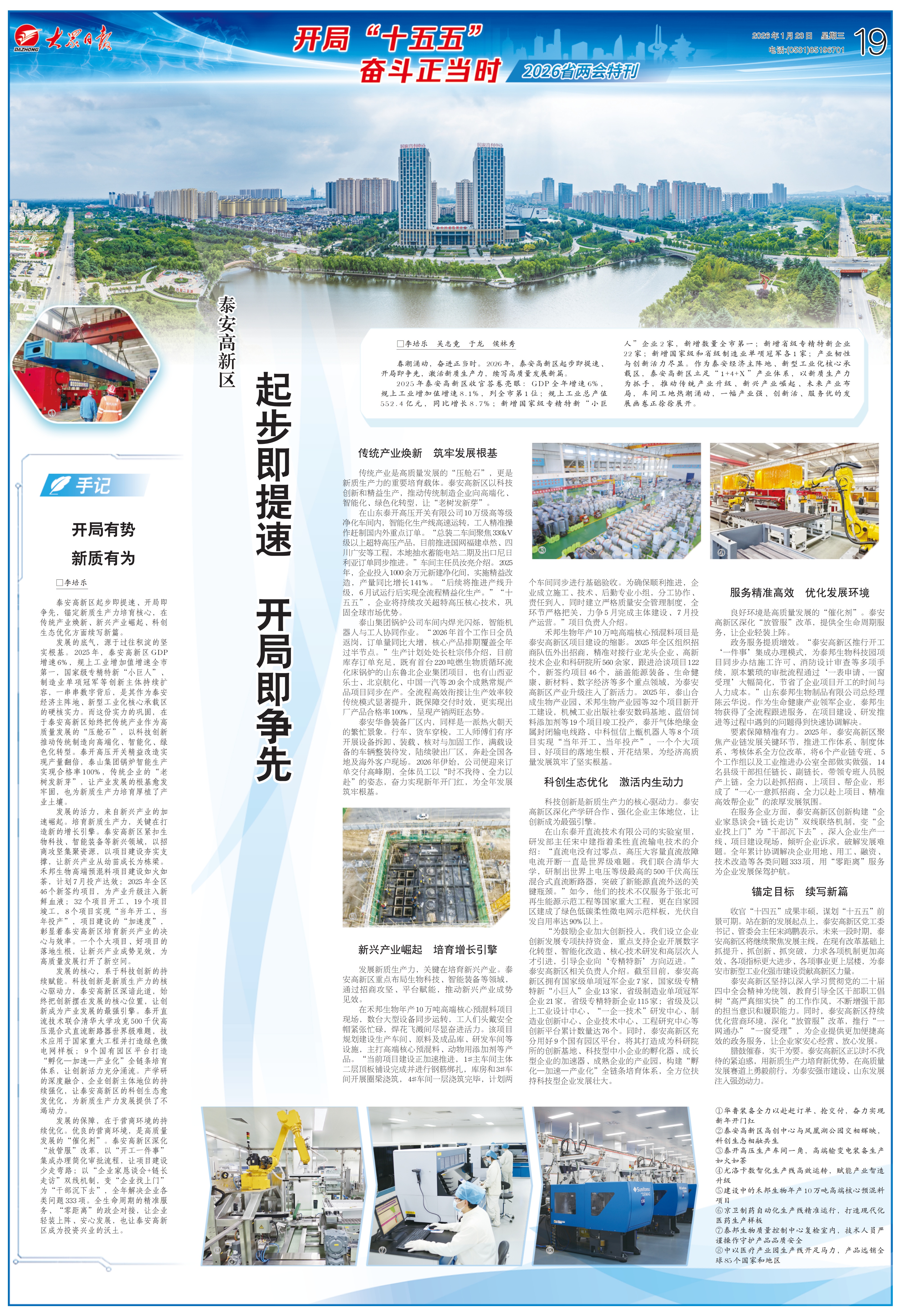 1月28日,19版“开局十五五 奋斗正当时”省两会特刊整版刊发《泰安高新区起步即提速 开局即争先》,报道泰安高新区立足“1+4+X”产业体系,以新质生产力为抓手,推动传统产业升级、新兴产业崛起、未来产业布局,一幅产业强、创新活、服务优的发展画卷正徐徐展开。详情请点击这里—