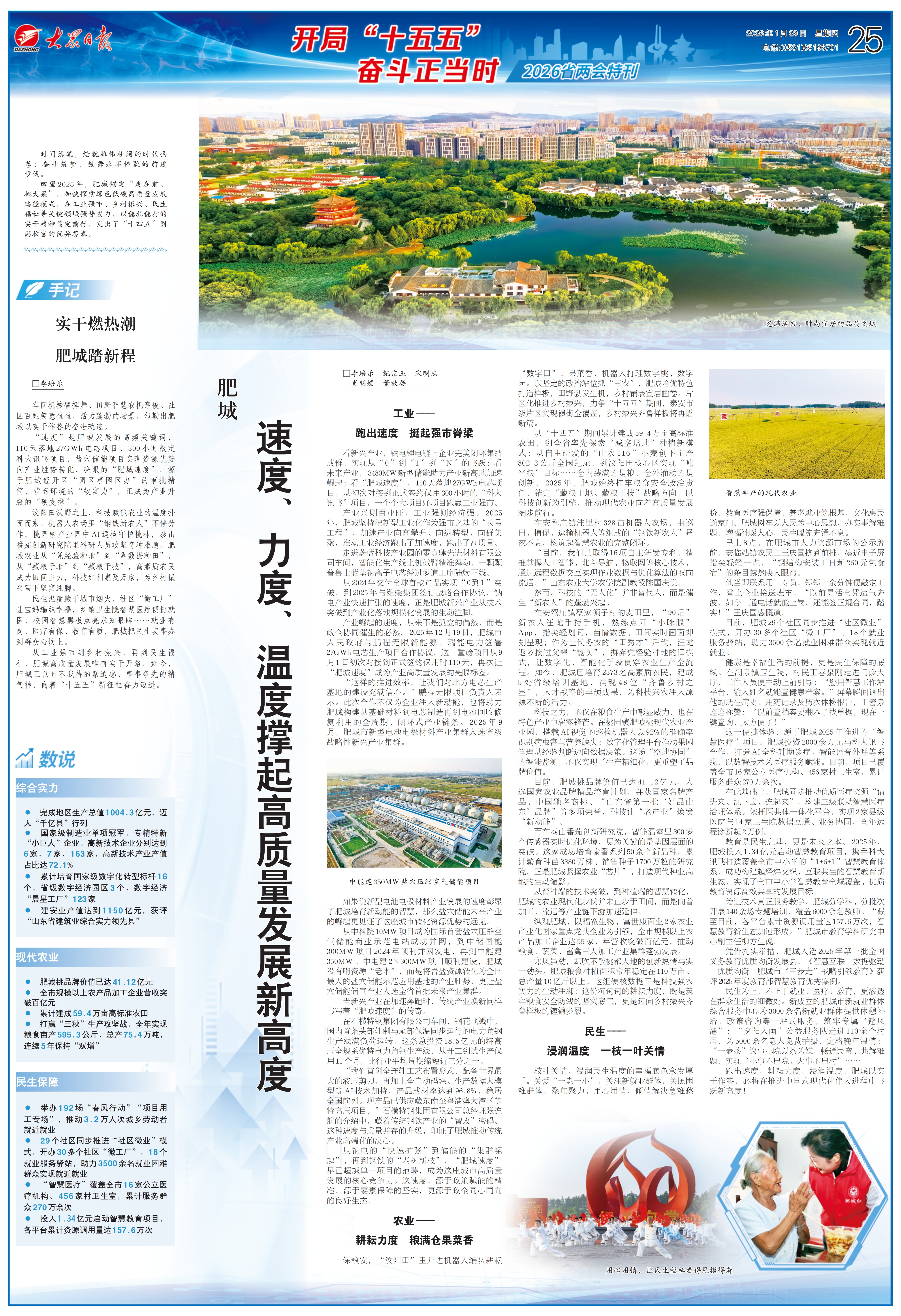 1月29日,25版“开局十五五 奋斗正当时”省两会特刊整版刊发《肥城速度、力度、温度撑起高质量发展新高度》,报道肥城锚定“走在前、挑大梁”,加快探索绿色低碳高质量发展路径模式,在工业强市、乡村振兴、民生福祉等关键领域强势发力,以稳扎稳打的实干精神笃定前行,交出了“十四五”圆满收官的优异答卷。详情请点击这里—