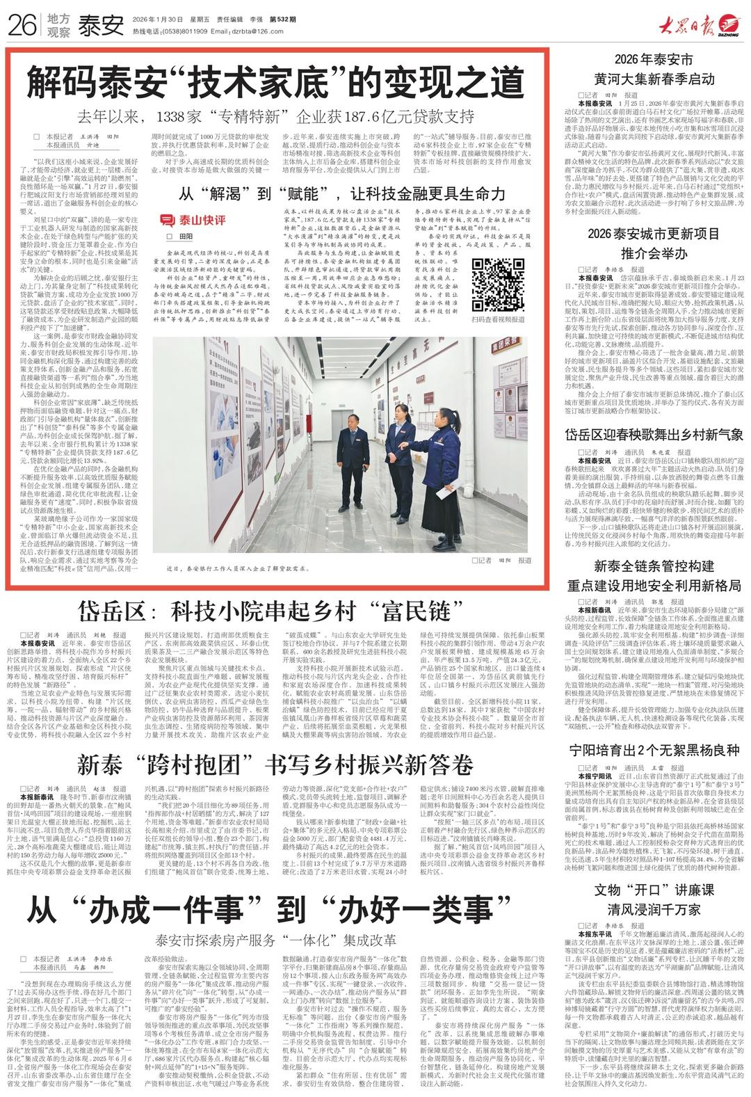 1月30日,大众日报《泰安新闻》推出重磅策划《解码泰安“技术家底”的变现之道》,报道泰安市财政局协同金融机构深化服务,通过构建完善的政策支持体系、创新金融产品和服务、拓宽直接融资渠道等一系列“组合拳”,为当地科技企业从初创到成熟的全生命周期注入强劲金融动力。详情请点击这里—