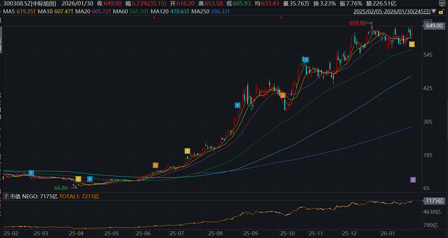 去年以来,得益于AI算力需求增长,新易胜、中际旭创、天孚通信三大光模块龙头企业,股价屡创新高,被股民称之为“易中天”。其中,中际旭创去年累计涨幅达397.5%,今年涨幅依旧,年初至今累计上涨6.39%。1月30日,截至收盘,中际旭创股价报收649元/股,较前一交易日增长5.73%,总市值7211亿元,位列山东A股上市公司总市值榜首。