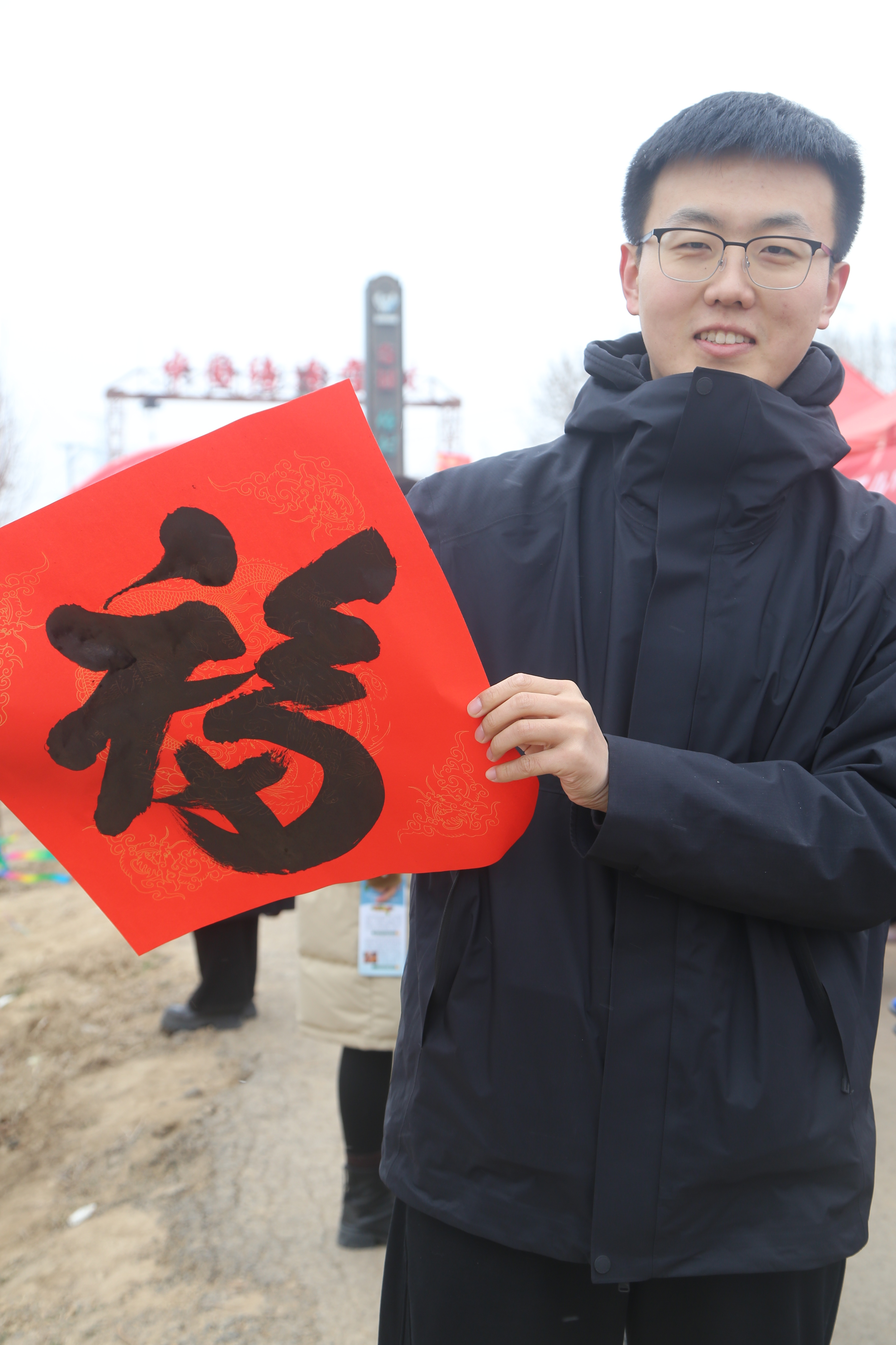 不远处,非遗展区同样热闹。阳谷张秋木板年画、阳谷烙画、阳谷面塑等摊位,吸引了不少年轻人围观。23岁的返乡大学生李卓文边拍照边说:“没想到咱们阳谷还有这么精美的传统手艺,我想跟着学学。”在旁边的展台上,书法爱好者们正将红纸铺展,挥毫泼墨,一个个饱满的“福”字、一副副吉祥的对联便跃然纸上。墨迹未干,便被围拢的村民们接过手中,笑语声中,已然透露出浓浓的年味。