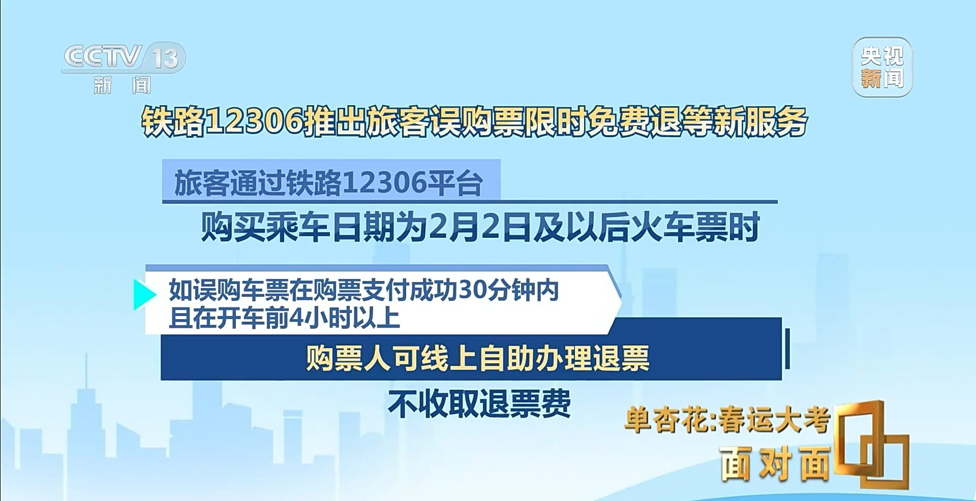 为了进一步提升旅客的购票体验,从1月19日开始,12306平台推出旅客误购限时免费退票的服务,旅客通过铁路12306平台购买乘车日期为2月2日及以后火车票时,如误购车票在购票支付成功30分钟内,且在开车前4小时以上,购票人可线上自助办理退票,不再收取退票费用。