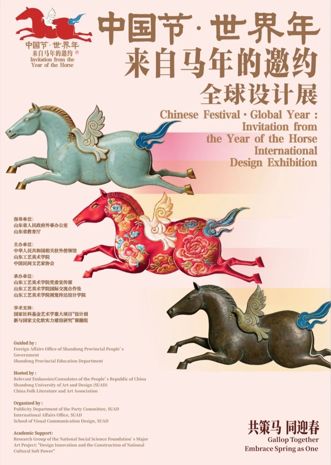 2026年,恰逢中国农历丙午马年,为通过马这一全球通识符号来呈现一种东方的世界观阐释方式,有效架起中华文明与世界其他文明沟通对话的桥梁,山东工艺美术学院将继续推出“向世界阐释中国”全球生肖设计展,本活动由山东省人民政府外事办公室和山东省教育厅作为指导单位,携手相关中国驻外使领馆、孔子学院等机构共同举办“中国节·世界年:来自马年的邀约”全球设计展,旨在以设计为通用语言,以春节为文化母题,以马年为时空坐标,策划一场跨越地理边界、融汇古今智慧、贯通中西文化,激发共同创造的全球性设计展事。